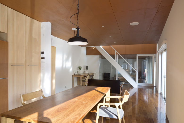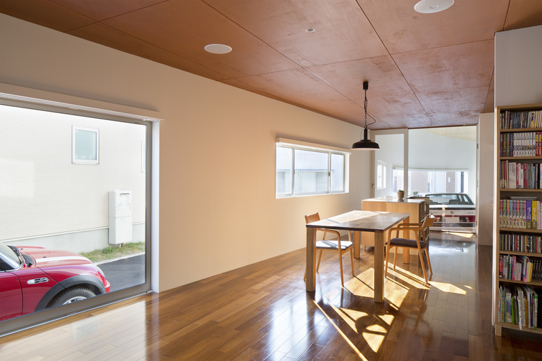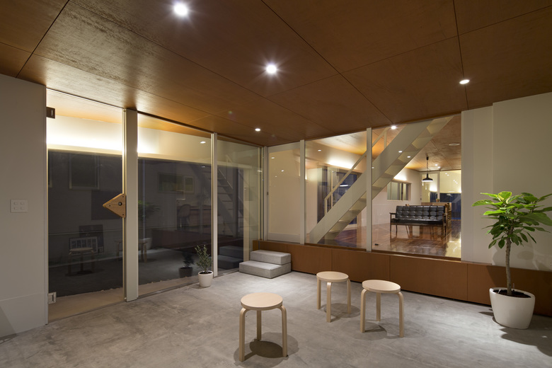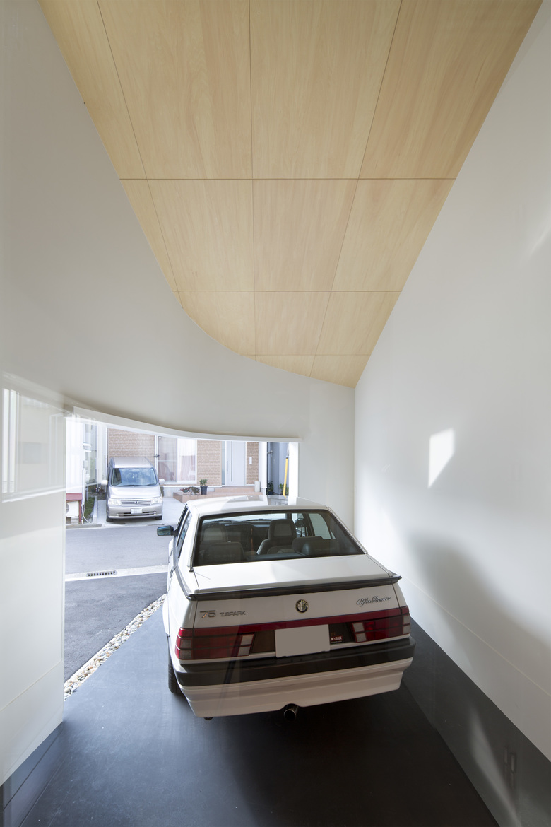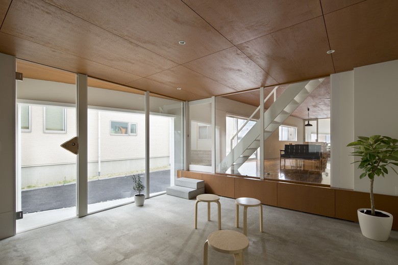 On the first floor, garage, dining/ kitchen, living room, and earthen floor are located, all of which are accessible from the private road through wide opening. When a neighbor visits the house to share dishes with the owner of the house, he/ she does not have to go through the entrance but simply go through the opening of the dining or kitchen. When a car enthusiast friend visits by car, the owner can go out from garage, usher the car inside and start car talks. The entrance which is at the back of the private road is spacious earthen floor which can be used for preparation of festivals and party after the festival.