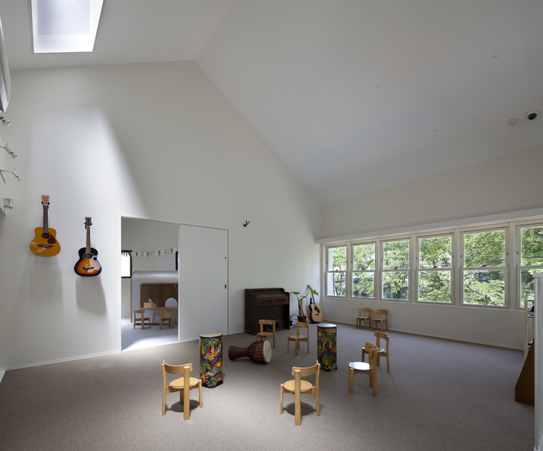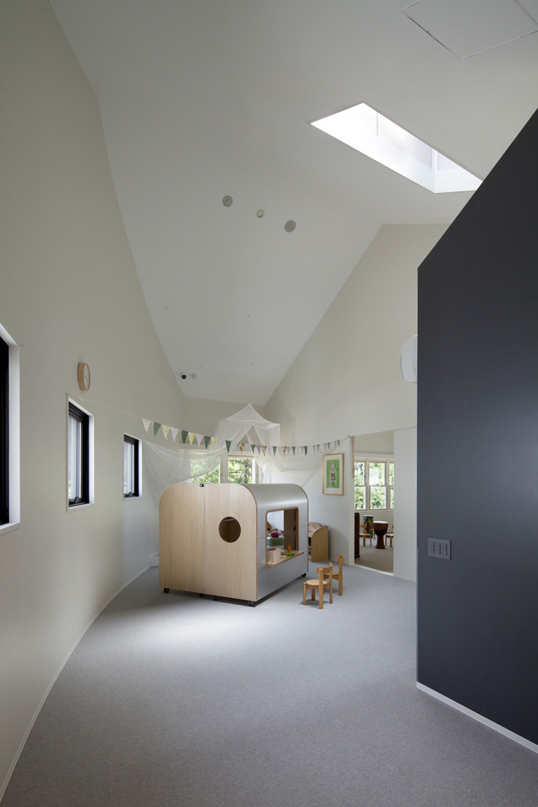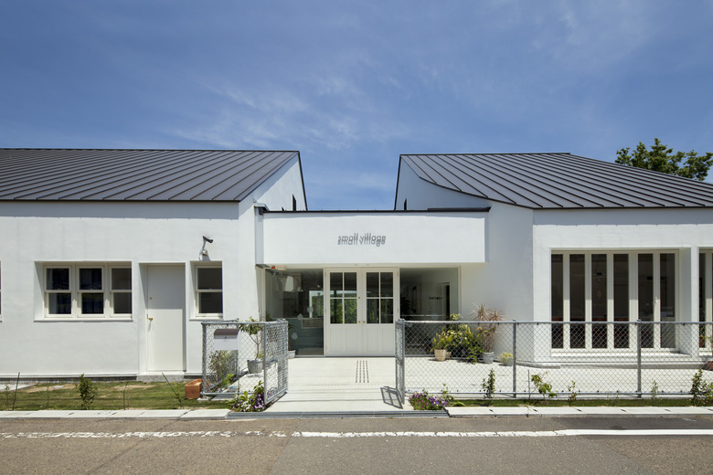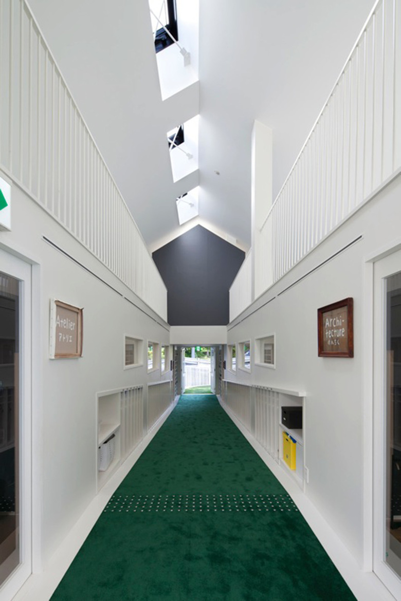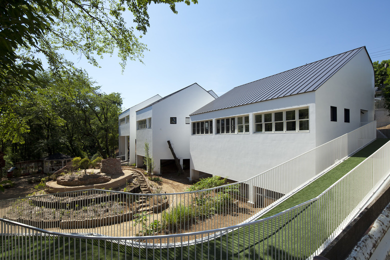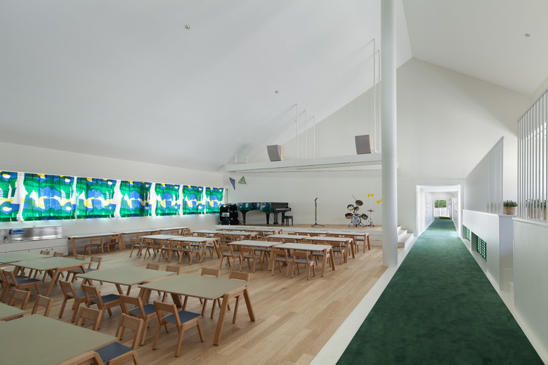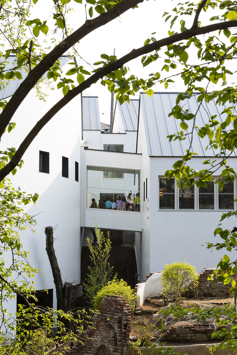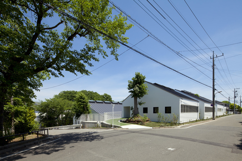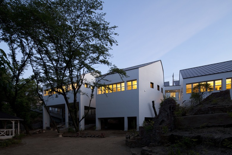 Nursery buildings for cross-age activities face the yard, and shared office, community cafe, town hall and playroom open to the community face the frontal road.