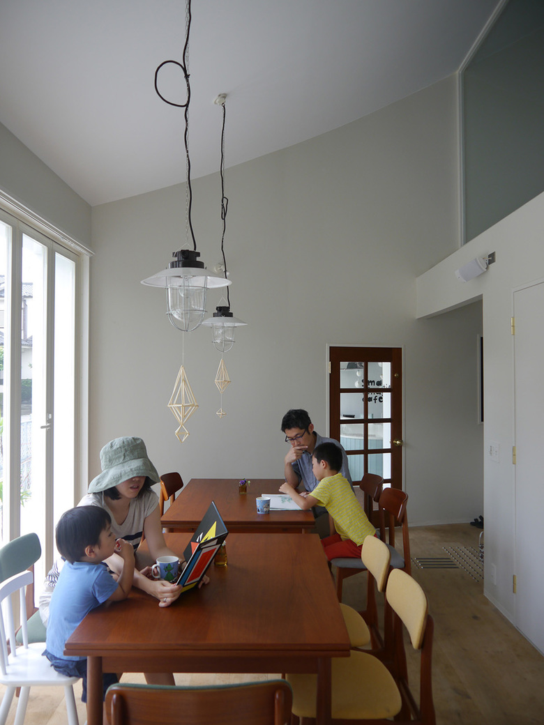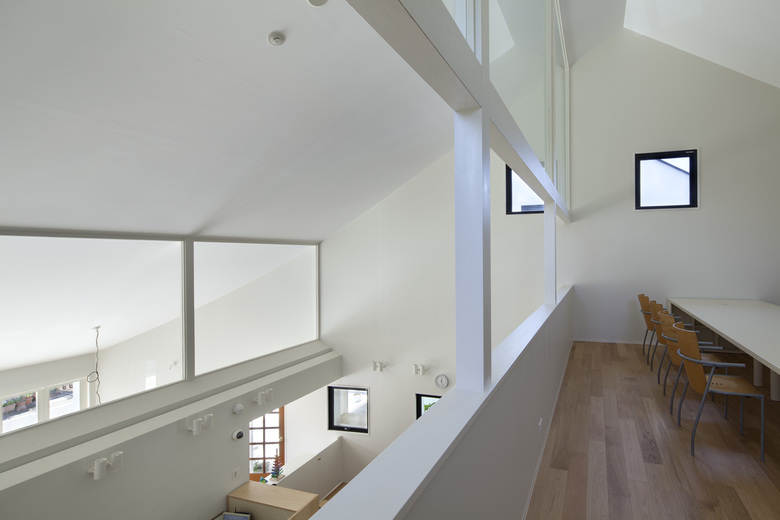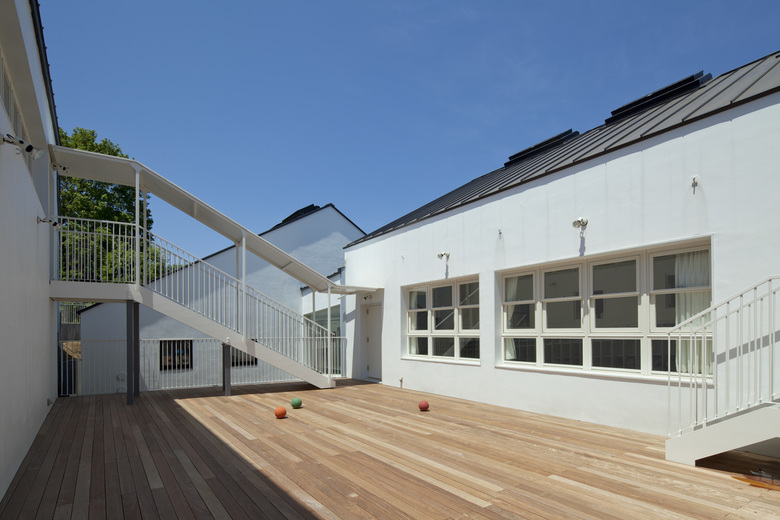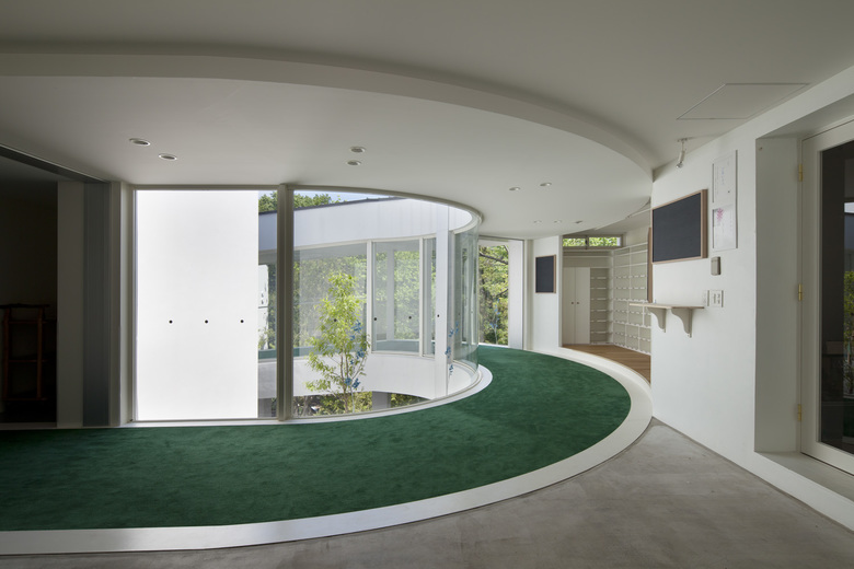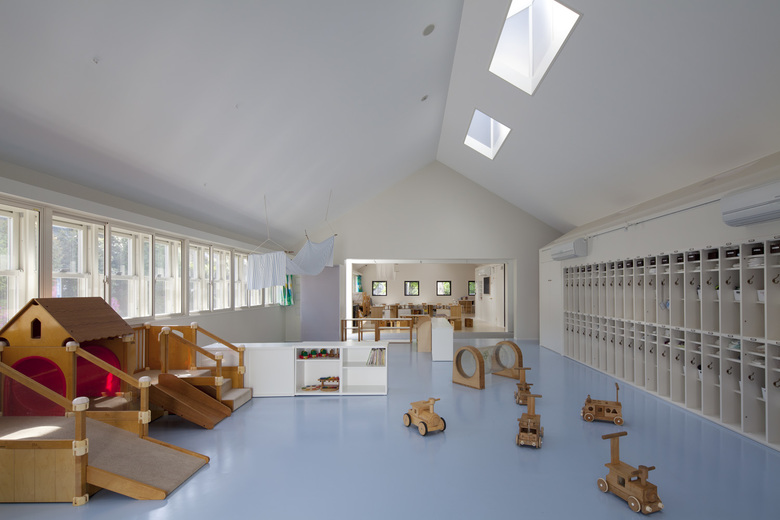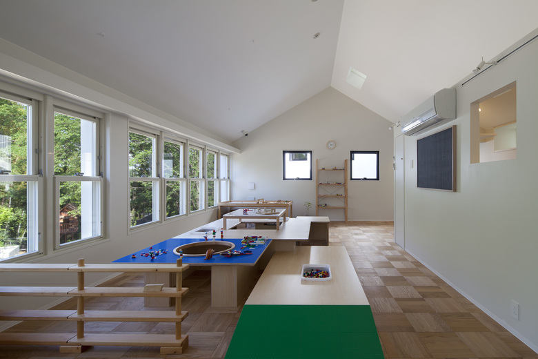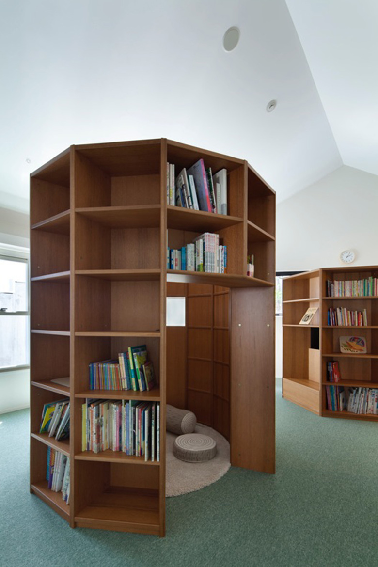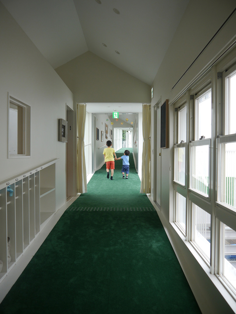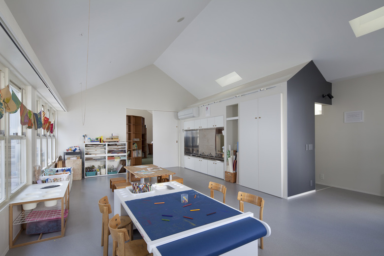 Nursery buildings for cross-age activities face the yard, and shared office, community cafe, town hall and playroom open to the community face the frontal road.