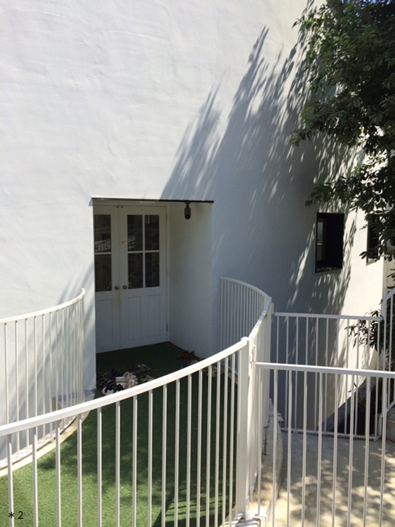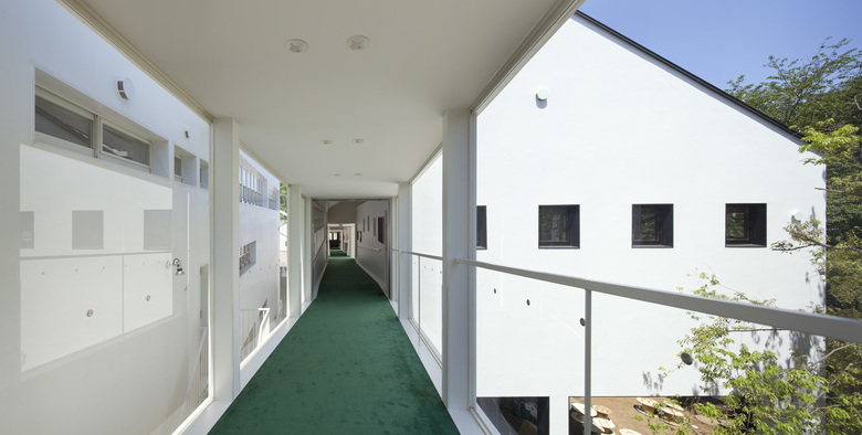 Seven buildings that stand on wooded hillside are connected by a long and gentle ramp running in a curve through trees giving access from frontal road above to flat yard at the bottom.