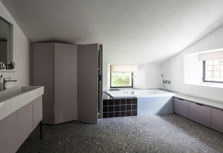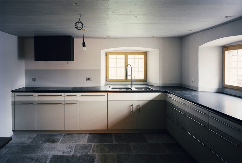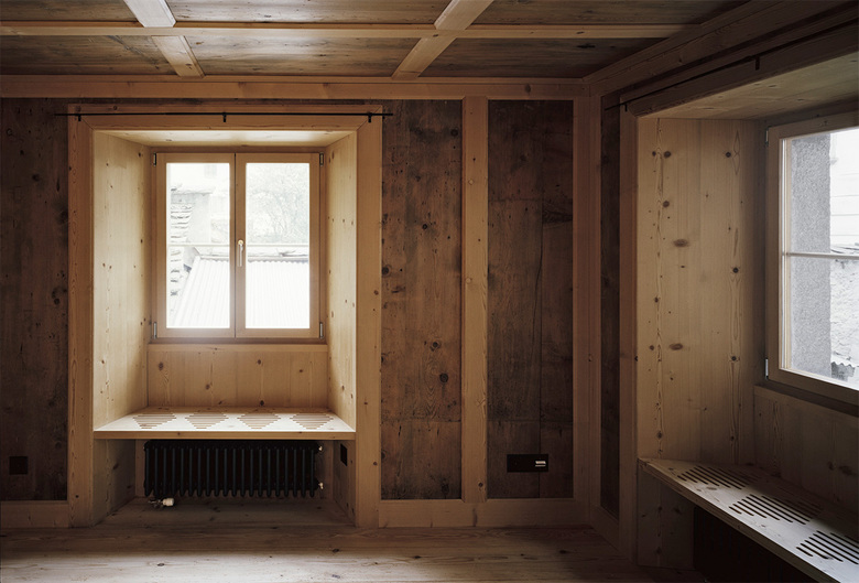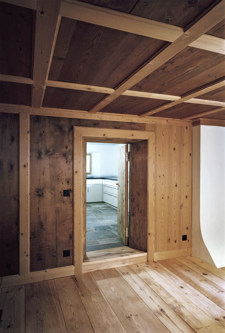 Sowohl für Gang und Treppenraum als auch für die getäferten Zimmer diente die ursprüngliche Gestalt als direktes Vorbild. Die Küche und die darüberliegende ehemalige Räucherkammer – als modernes Bad geplant – wurden dagegen in grossem Umfang erneuert und nehmen die zeitgemässe Infrastruktur in sich auf, ohne ihren rohen Charakter zu verlieren. Die eingezogene Betondecke – schwarz eingefärbt und geschliffen – bleibt als Boden sichtbar. Als neues konstruktives Element übernimmt sie die horizontale Verteilung der grossen Dichte an notwendigen Leitungen, die über die Hohlräume der Gewölbewangen und den bestehenden Kaminschacht vom Technikraum im Keller in die oberen Geschosse gezogen wurden, und dient ausserdem durch Bauteilaktivierung der Wärmeabgabe in Küche und Bad.
