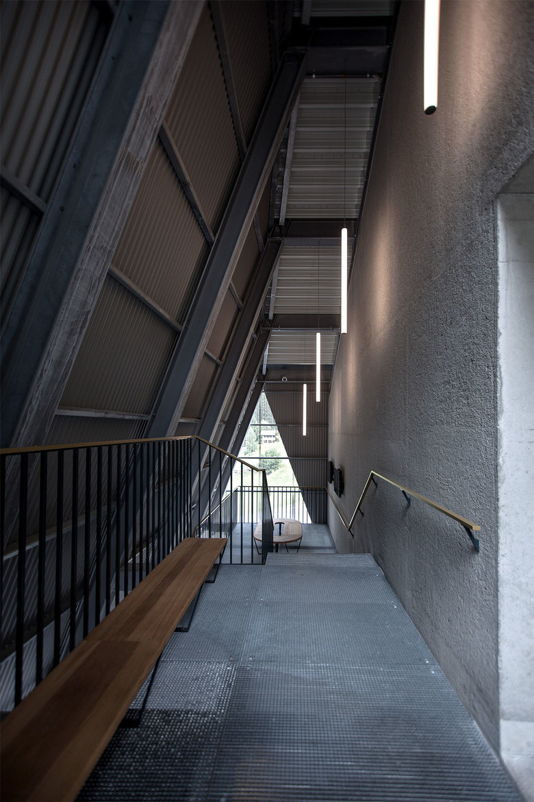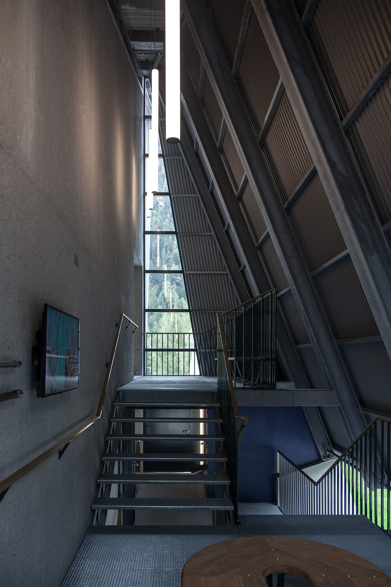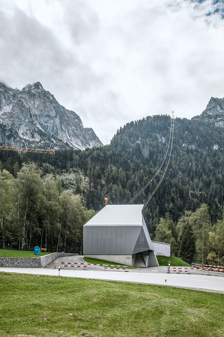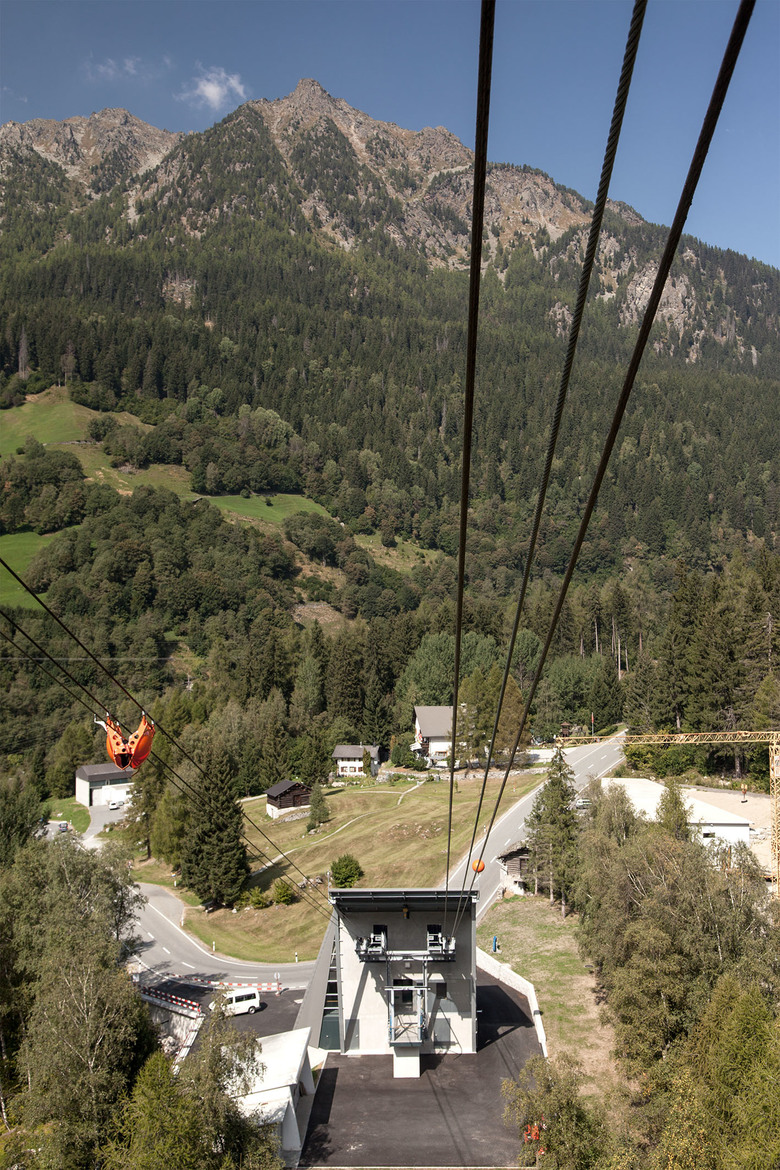 Zu Beginn der Suche nach einer Gestalt der Tal- sowie der Bergstation stand in der Konsequenz die minimale, ökonomische Ummantelung des Maschinenraums als betriebliche Grundvoraussetzung. In derselben industriellen Sprache, darin jedoch als präzise architektonische Geste formuliert, wurden die restlichen Funktionen daneben arrangiert, mit der Seilbahninfrastruktur unter einer Hülle vereint und in der Topografie zu einer prägnanten Figur geformt. Die Gebäude sollen in Einfachheit, jeweiliger Eigenständigkeit und evidenter Form erscheinen und sich als adäquates Gesicht der Elektrizitätswerke zeigen.