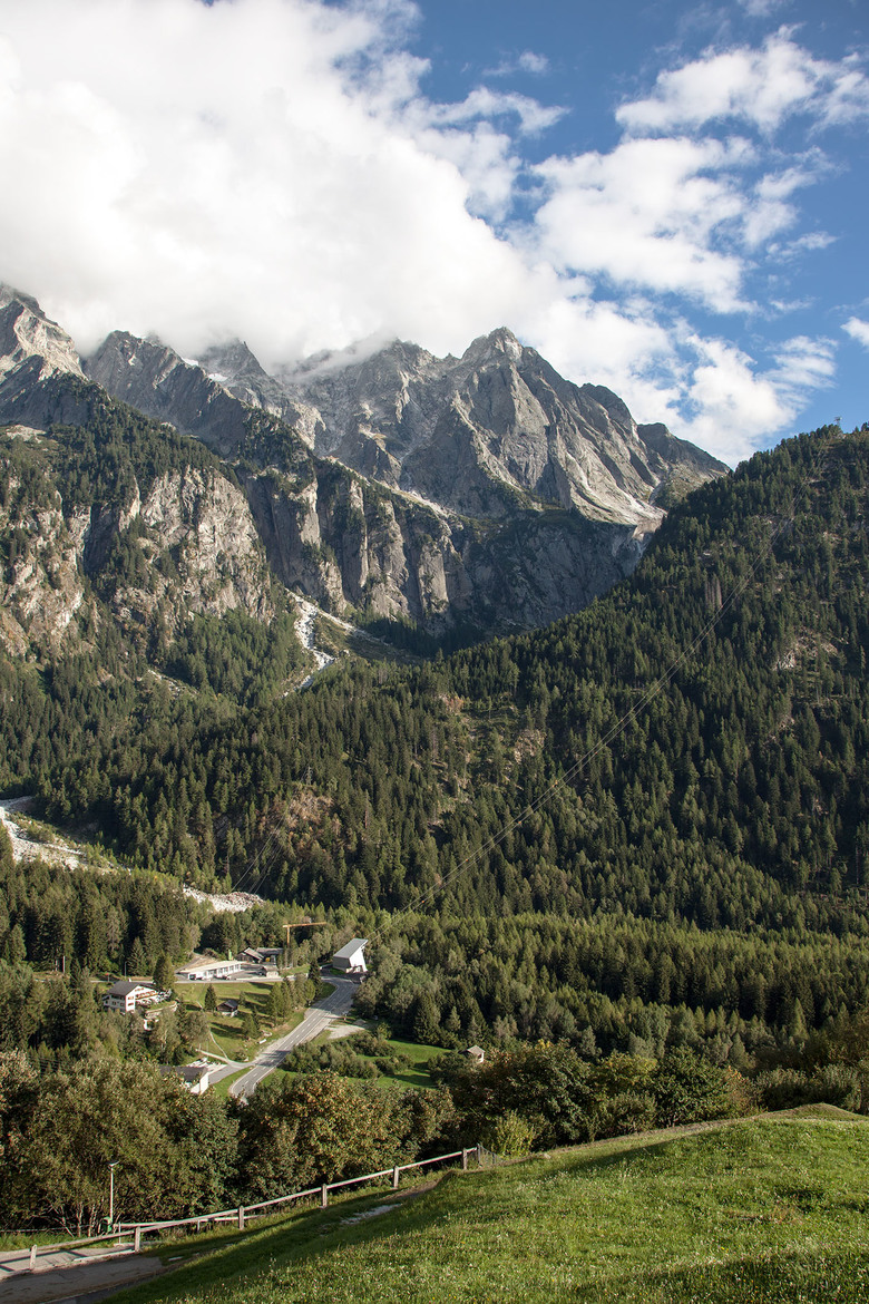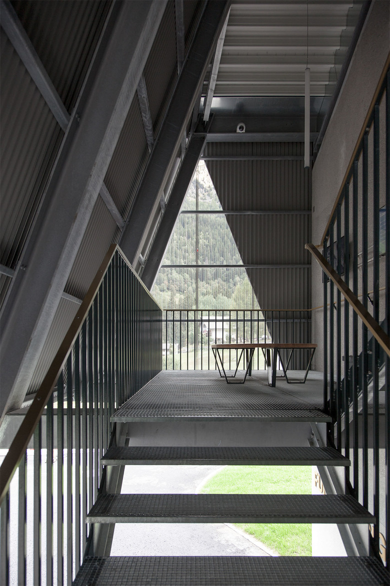 In der Talstation - prominent an einer Spitzkehre im Talboden gelegen – wurde die umhüllende Stahlstruktur seitlich aufgefaltet und angehoben und darunter die Erschliessung als zentrale Funktion an die Mauer des Maschinenraums gelegt. Die skulpturale Verformung richtet das Gebäude aus, verankert es am Ort und eröffnet es gleichsam in einladender Geste dem Besucher. Unter dem ausgefalteten Saum der Hülle entwickelt sich ein vertikal zulaufender Raum, der den Strassenraum in direkter Manier mit der Seilbahn verbindet. Über eine ausladende Treppe aus gestocktem Beton erfolgt der Einstieg in die Stahlkonstruktion, die an die sakral anmutenden Hohlräume der Staumauer erinnert und im allmählichen Aufstieg den Weg zur ‚Albigna’ beginnen lässt.