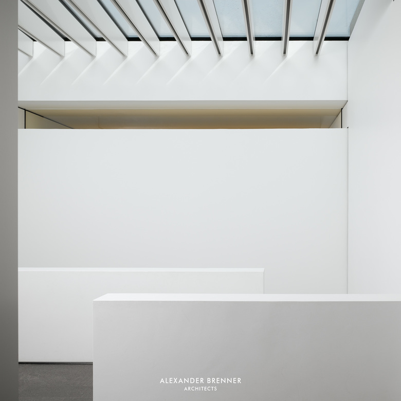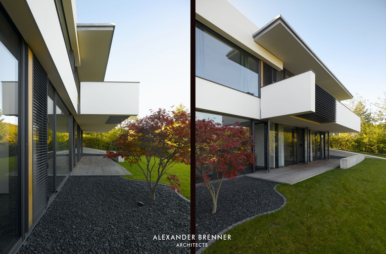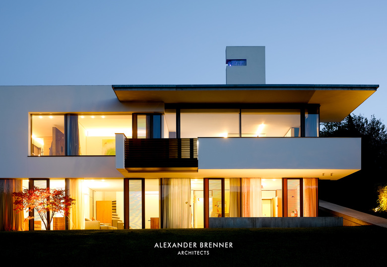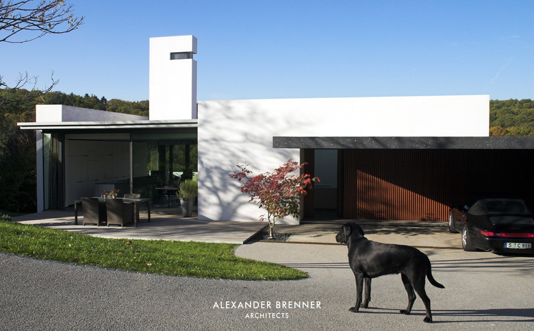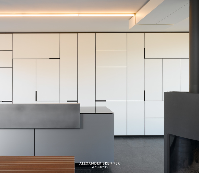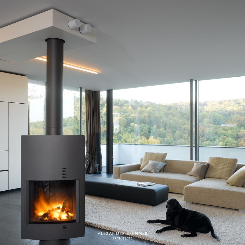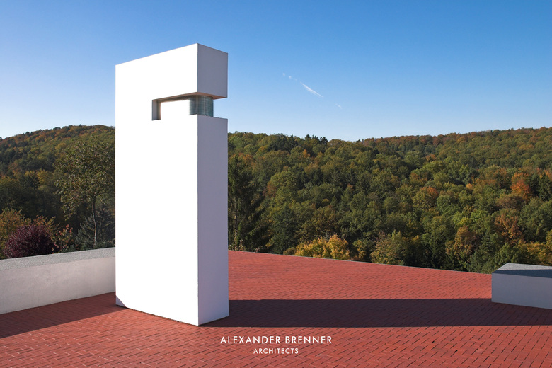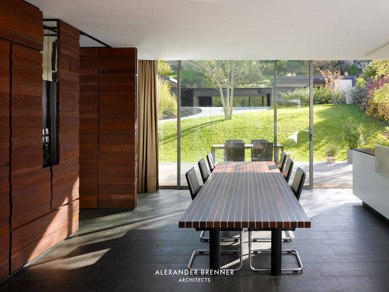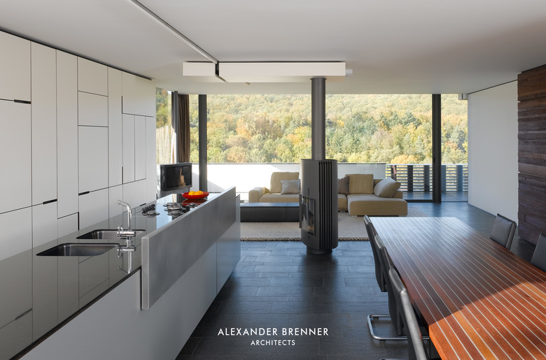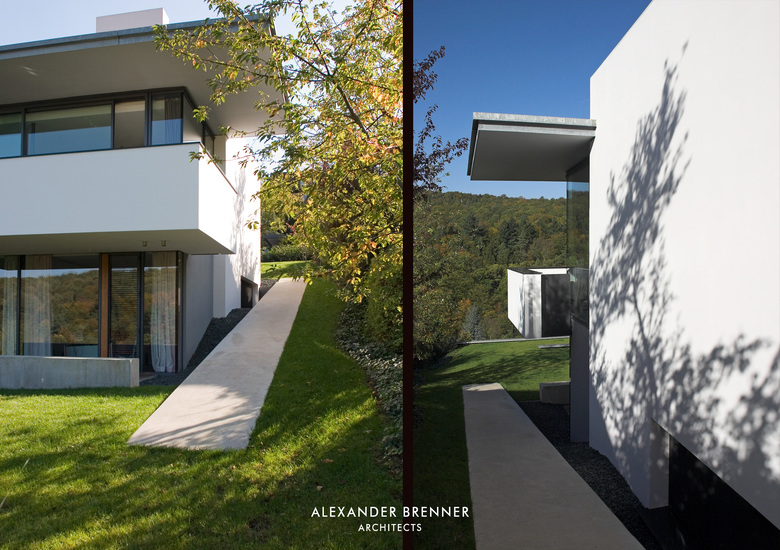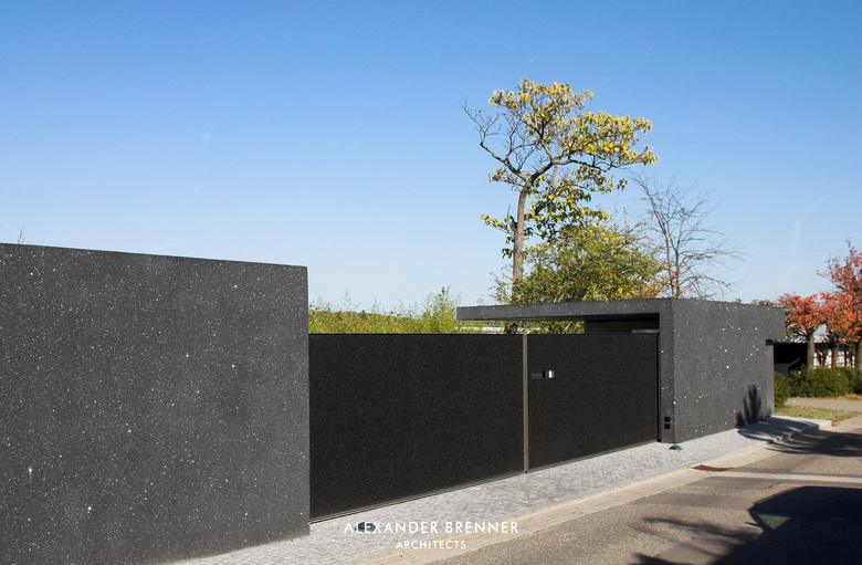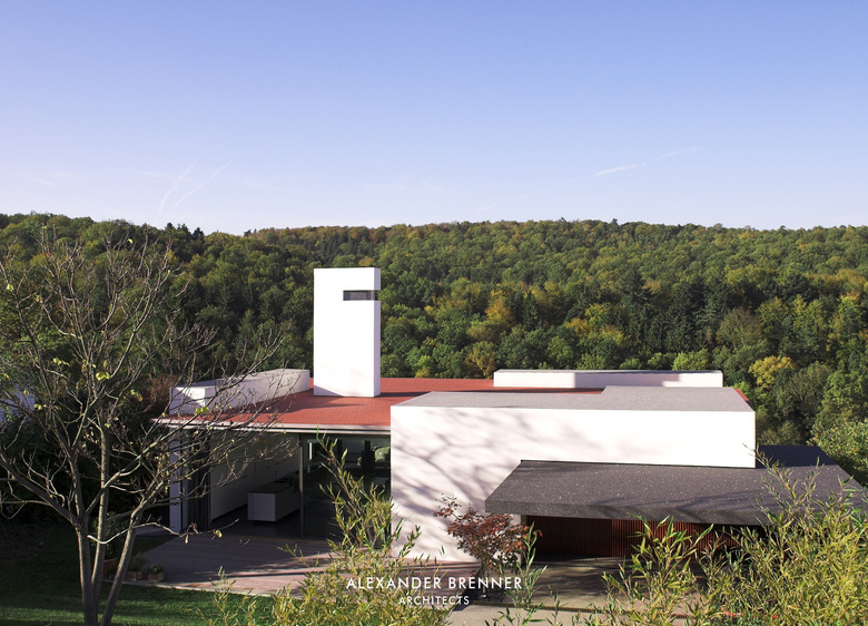 Two anthracite-coloured building volumes glittering in the sunlight can be seen from the road. The gate in between them opens to a private world. From up here, one looks down to the residence, a building composed of light-coloured cubes and dark rectangular slabs. The roof, which is paved with red bricks, braces the single building units. Approaching the house via the curved access road reveals the contrast between the solid cubes and the lightly-weight, cantilevered sections. The entrance area is roofed over by such an extremely projecting angled slab. Like the carports at the entrance to the site, this slab is covered with a silicon layer, which sparkles in sun and moonlight. This surfacing finish was refined as a versatile coating system by the architect in a painstaking development process. The entrance leads to a central atrium with a glass roof, which allows sunlight right down to garden level, which is oriented towards a wood opposite the house. From the central hall, a rough wooden wall section leads to a bright living space with a kitchen and dining area. A turnable fireplace is positioned between the eating and living areas. The fireplace’s distinctive extension penetrating the roof clearly emphasises this important area towards the outside. Full-length and full-width glazing on the south side and on the front with the view gives the living area a depth that extends beyond the boundaries of the house.