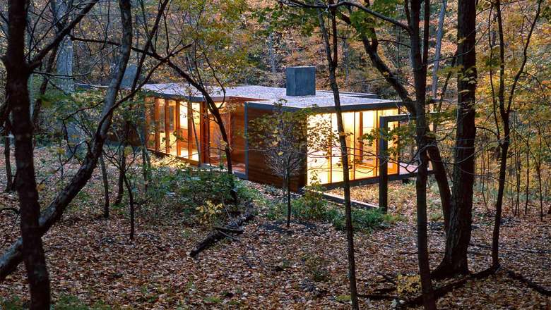Balanced above a bend in Ryder Creek, the guest house is located in a mature deciduous forest of oak, hickory, and birch. The two-bedroom, 1300sf house is held within a continuous structural frame of eight-inch steel that weaves through the site, blurring the boundaries between forest and house. Enclosures and terraces are formed by panels of wood and glass that slip between, over, and through the frame as it meanders among the trees. The house is reached by a path through the woods from the Main House meadow. Each room of the house looks to a different region of the site, emphasizing closeness and connection to the landscape.