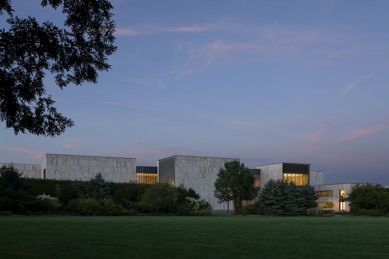 The grasslands, gardens, and forests of the Arboretum provide the inspiration for the museum’s design. A series of interlocking pavilions places the Palmer within the flows of the greater landscape. Each pavilion is clad in sandstone sourced from local quarries, evoking the geology of central Pennsylvania. The pavilions, in turn, define distinct courtyards and create space for terraces and gardens, designed in collaboration with landscape architect Reed Hilderbrand. The Dr. Keiko Miwa Ross Gateway—an overhead bridge joining the Palmer’s two main wings that house public gathering spaces and exhibition galleries in the west, and administrative offices, classrooms, and educational spaces in the east—creates a new gateway into the H. O. Smith Botanic Gardens, and the Pollinator and Bird Garden beyond, connecting people to landscape, and landscape to art.
