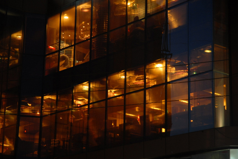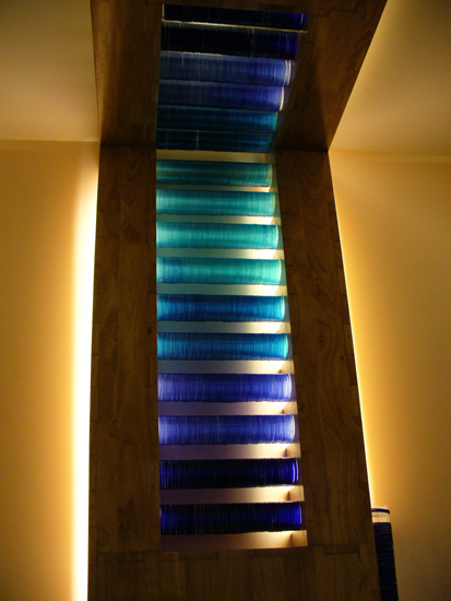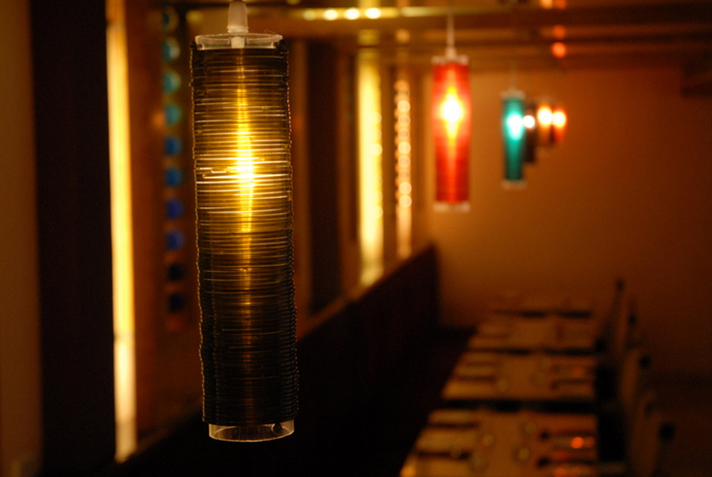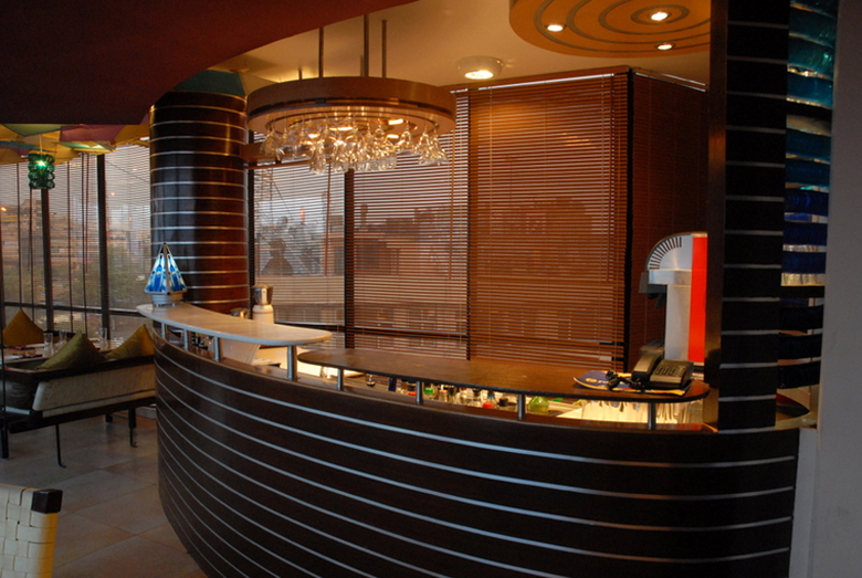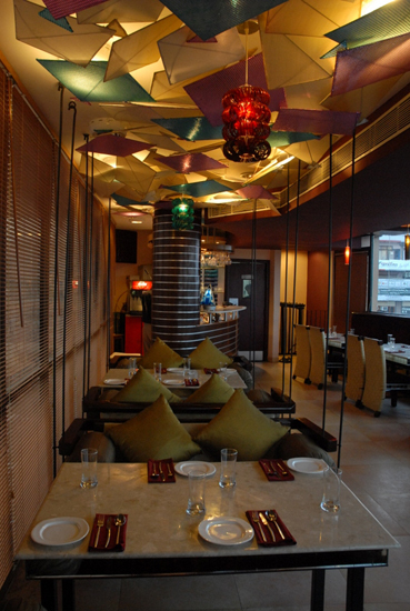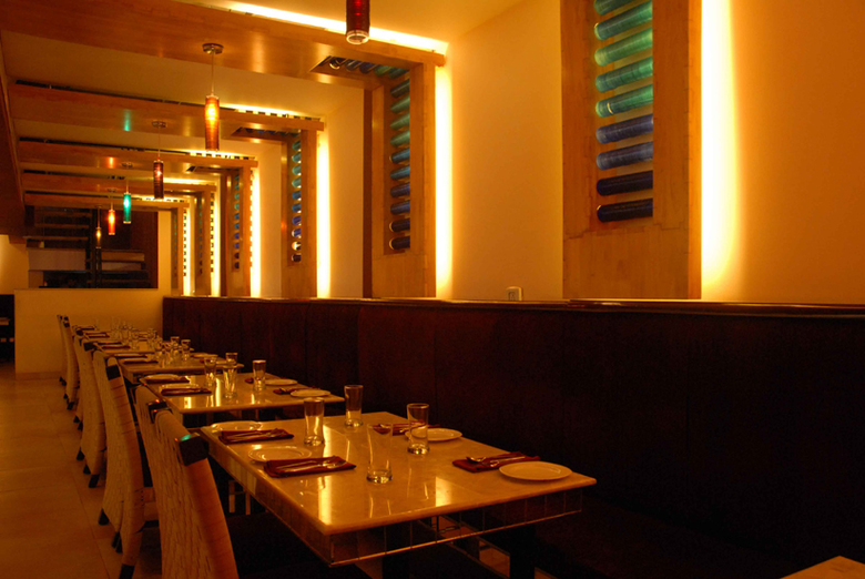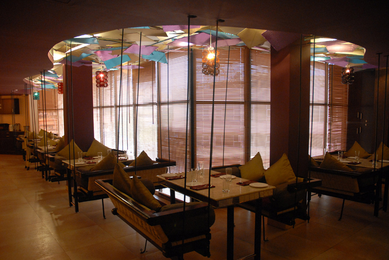 The luminaires and ambient lights were custom designed using multi-hued glass bangles. The portions of the ceiling visible from the street was designed as a compostion of numerous kites made of sequined fabric stretched onto steel pipe frames representing the jostle for space in the monsoon skies across the Indian sub-continent. The bar is compostiion of swirling lines and masses that echo the churning monsoonal skies.