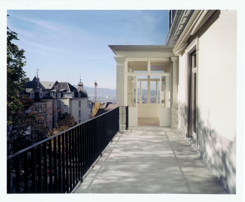 Gemäss den Anforderungen der Denkmalpflege durfte die von uns neu erstellte, über der neuen Mansardenwohnung liegende Dachterrasse von aussen nicht in Erscheinung treten. Wir fanden eine Möglichkeit dieser Bedingung gerecht zu werden, indem sie sich versteckt hinter dem Mittelrisalit der Westfassade befindet.