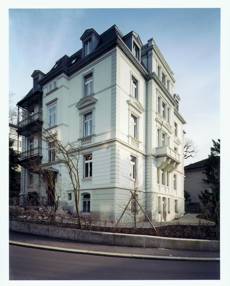 Das fünfgeschossige inventarisierte Mehrfamilienhaus in der Stadt Zürich wurde 1895 von Grether und Cie. erstellt. Beeindruckend ist die grosszügige, klassizistische Grundrissanordnung mit dem grossen zentralen Erschliessungsraum, von wo aus alle Zimmer zugänglich sind. Die hohen Räume mit Stuckaturdecken, die kunstvoll gestaltete Treppenhausverglasung, die alten Parkettböden und die vielen über alle Zimmer greifenden Enfiladen prägen den Charakter der Geschosswohnungen. Bei der sanften Renovation haben wir diesen Charakter erhalten und gleichzeitig den Standard der Wohnungen mit dem Einbau neuer Küchen und zusätzlichen Nassräumen gehoben. Im Untergeschoss ist es uns gelungen, ein grosszügiges, teilweise ebenerdiges neues Atelier einzubauen.