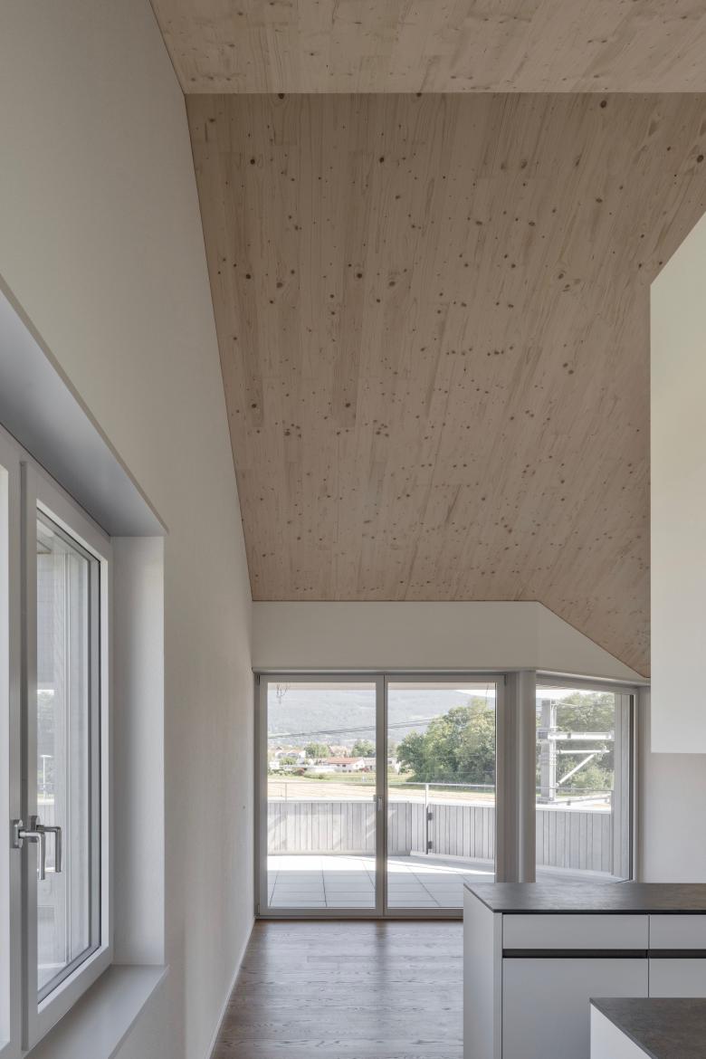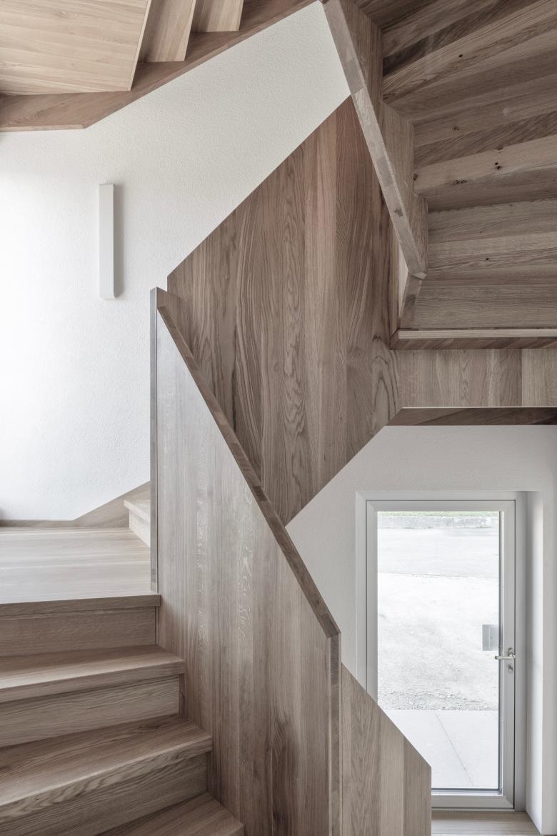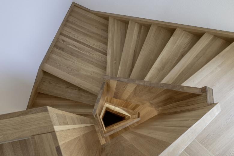 Im Innern offenbart sich das Herzstück des Gebäudes. Die aus massiver Eiche konstruierte Holztreppe, welche nur ein paar Tagen vor dem Bezug der Wohnungen aufgerichtet wurde, windet sich wie eine Spirale in die Höhe und verbindet die drei Geschosswohnungen inkl. Keller miteinander.