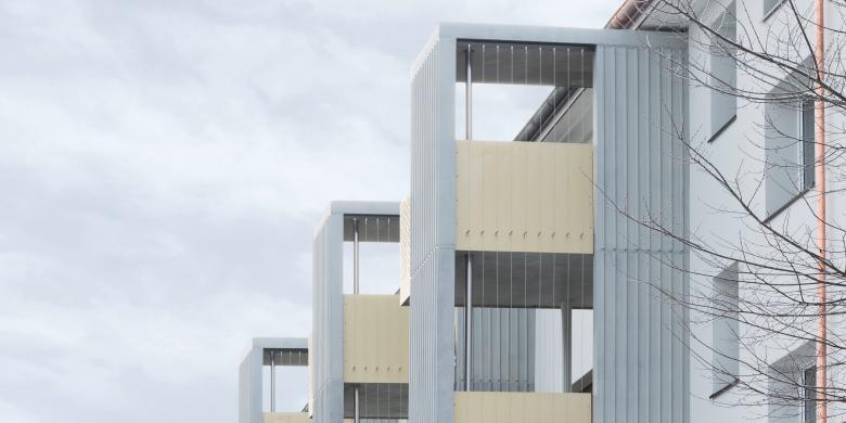 Bei der Materialisierung von den von uns geplanten Eingriffen orientierten wir uns an weiteren Bauten der Architekten Richner und Anliker aus den 40-er Jahren. Das vertikale Trapezmotiv an den Betonelementen spiegelt die ursprünglichen Blechverkleidungen der Balkonbrüstungen wieder.