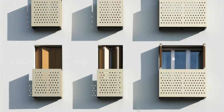 Die nach Westen, entlang der stark frequentierten Strasse, ursprünglich vorhandenen Balkone wurden durch sogenannte „französische Balkone“ ersetzt. Die Holz-Jalousien wurden entfernt und durch Faltschiebeläden, welche bei geöffnetem Zustand aus den Leibungen ragen, ersetzt. Die bronzefarbig anodisierten Aluminium Fronten der Faltschiebeläden wurden mit einer feinen Perforierung versehen.