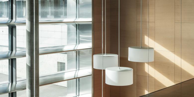 Aus Respekt zum Bestand haben wir das vorhandene Materialkonzept übernommen und weiter entwickelt. Sichtbetondecken mit roher Tafelstruktur und Wandverkleidungen aus Buchenholz prägen den Innenraum.