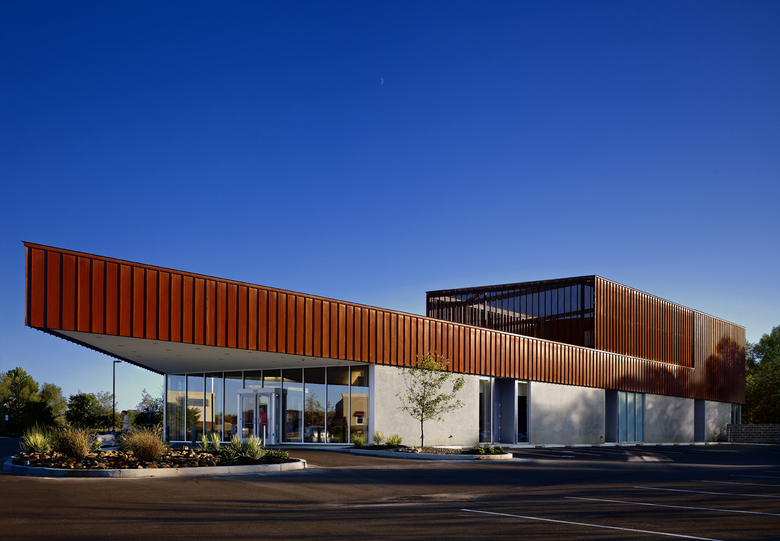 Attention was given to how interior spaces viewed the creek and how a space could be made between the tree line of the creek and the building. The building’s volume is broken into two primary parts: a concrete base with corrugated metal and storefront infill, and a weathering steel ‘cap’ that articulates the triangular shape and hovers above the main entrance.At the building’s base, the corrugated metal panels are used as a counterpoint to the glass and concrete panels. The darker color and heavier texture of the corrugated panels allow them to recede from the lighter and more reflective surfaces of the concrete and glass. The weathering steel cap is comprised of standing seam cor-ten panels, whose seams are oriented vertically to accentuate the volume of the parapet and second floor. The rooftop equipment is wrapped in perforated standing seam panels, to provide ventilation while enhancing the monolithic scale of the building’s cap.
