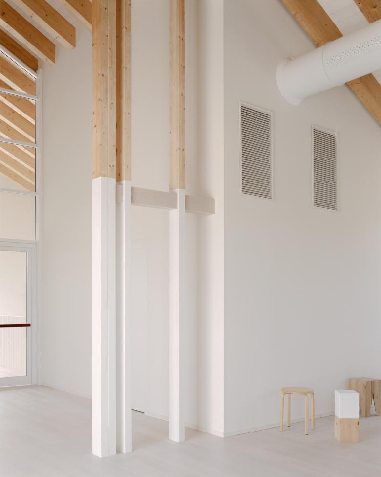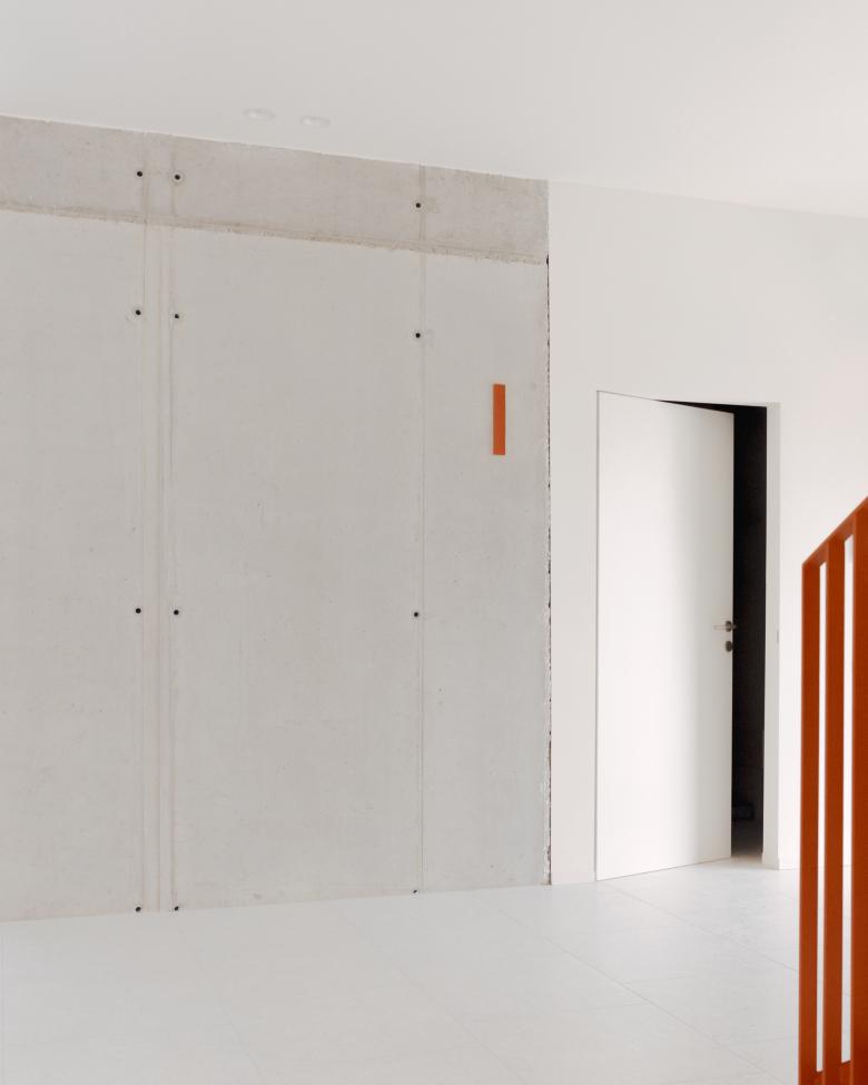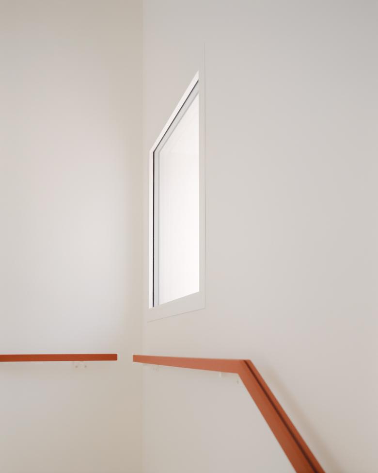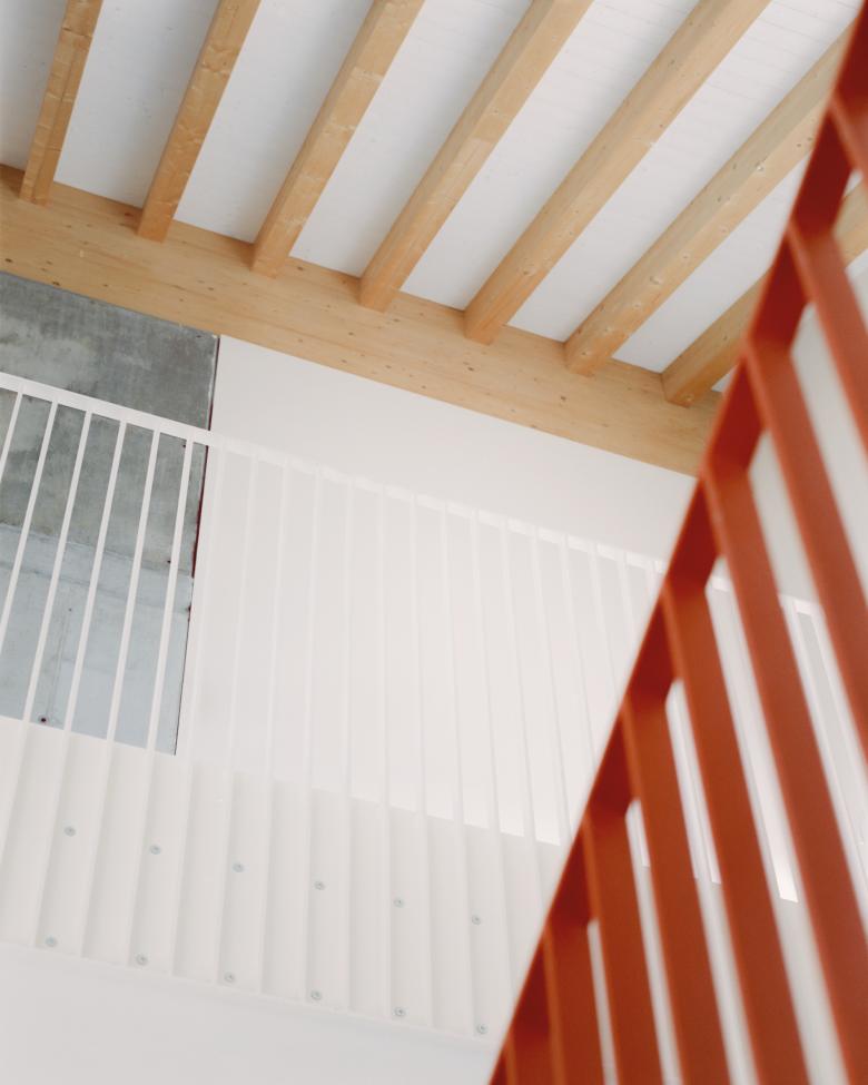 The lower building stands on the opposite side from the road and with its retreat defines the public space, which is further clarified by the presence of the samll garden.