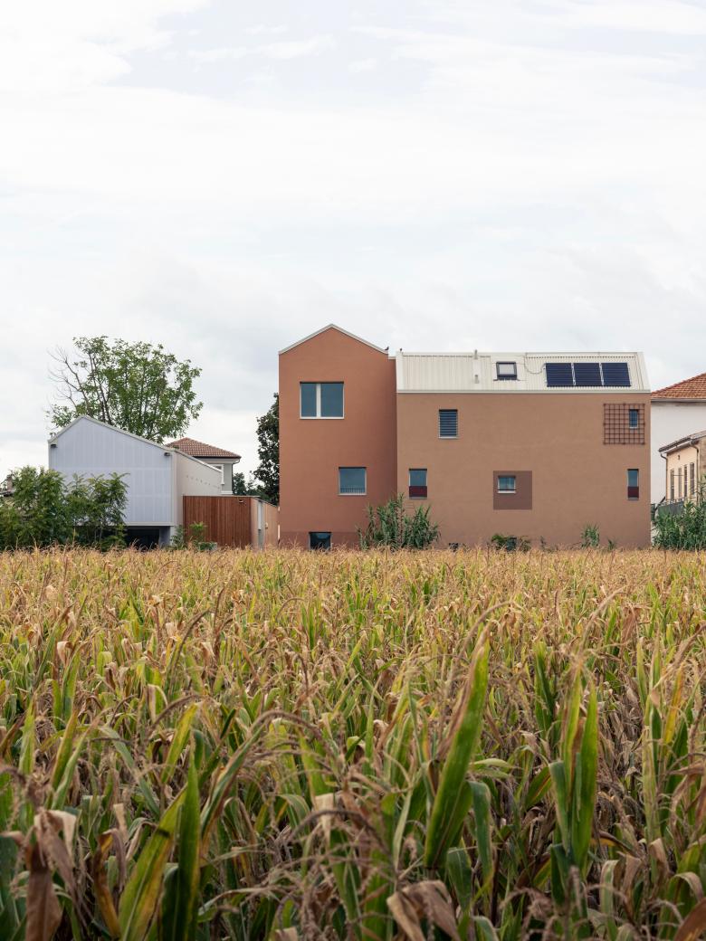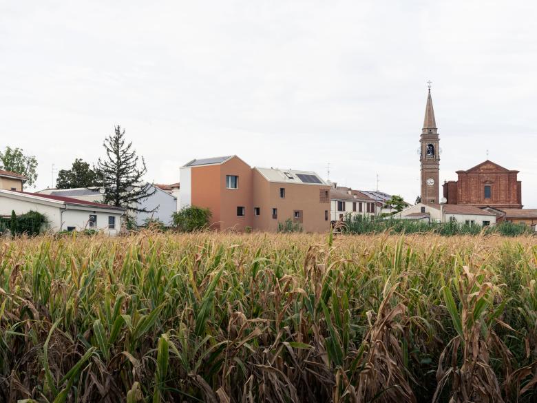 The facade on the open public space defines the access hierarchies while the rear front enriches the possible dialectics with the outside: the portions of the lower openings cuts out a fragment of the countryside, while the upper portion covered in polycarbonate, is configured as a lantern which, illuminated at night, it becomes an element of orientation in the surrounding agricultural fields context.