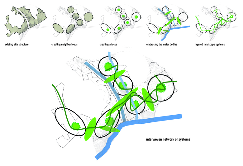The planning effort is driven by the idea to break down the development into smaller neighborhoods with individual open spaces to provide them a unique sense of place. These are tied together with the other neighborhoods through landscaped connections and an inter-linked open space network.