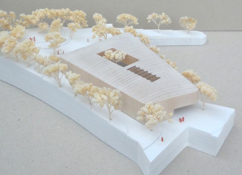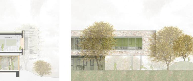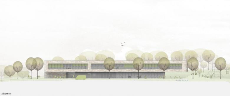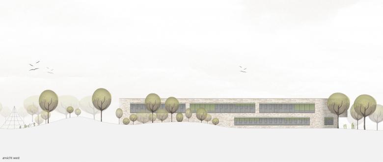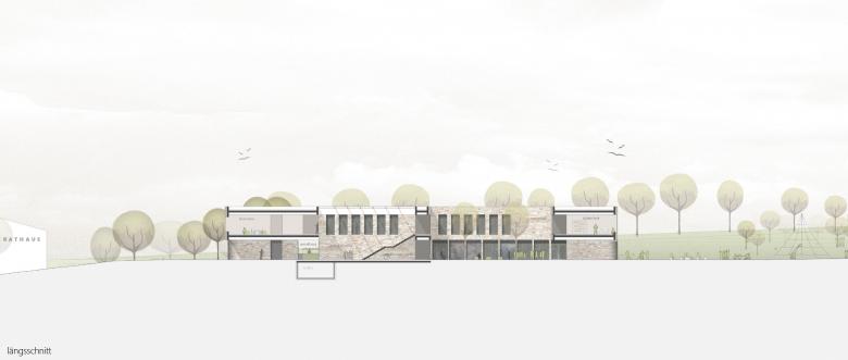 Der Ort Staufenberg spannt sich zwischen zwei Polen auf: im Norden die Burg mit den steilen, schmalen Gassen, mit Fachwerkhäusern und großartigen Ausblicken in die Landschaft - im Süden das funktionale Zentrum des Ortes mit Stadthalle, Rathaus, Restaurants und vielen Einkaufsmöglichkeiten. Der Neubau der Schule wird direkt am Rathaus entstehen und soll die Struktur und die Bedeutung dieses südlichen Zentrums stärken. das Rathaus steht als Solitär in einer topographisch stark bewegten Landschaft, in der großkronige Laubbäume und Rasenflächen dominieren. Dieses Prinzip wird für den Neubau der Schule aufgenommen, Die Schule wird als kompakter, zweigeschossiger Solitär im südlichen Teil des Grundstücks platziert, der Ortsmitte und dem Rathaus zugewandt. Die charakteristische Freiflächengestaltung wird Richtung Norden bis über den Anschluss der Brunnenstraße fortgesetzt. Entlang der Mainzlarer Straße wird ein zusammenhängender Grünzug wahrnehmbar, der die Gestalt der Ortsmitte prägt - die „Grüne Mitte“ Staufenbergs.