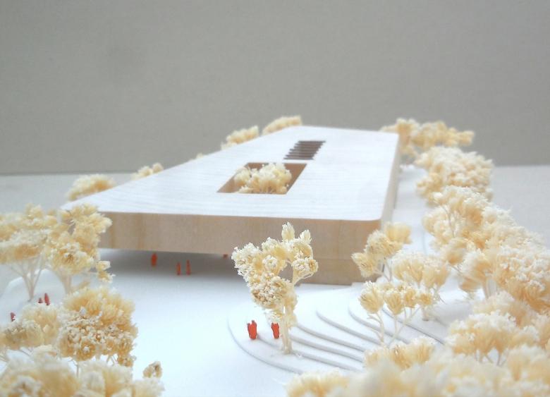 Das Gebäude erinnert an einen Stein, der in der Wiese liegt.