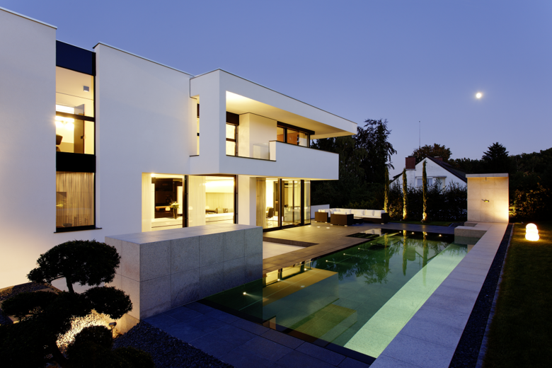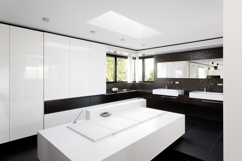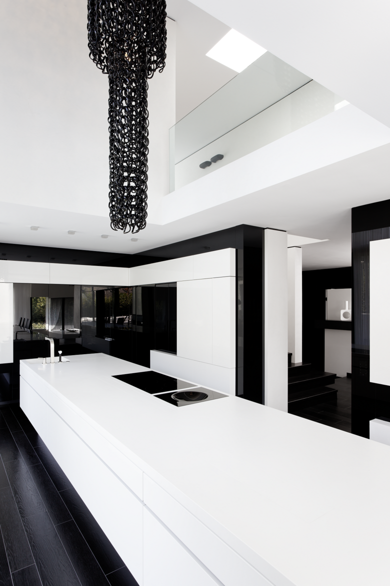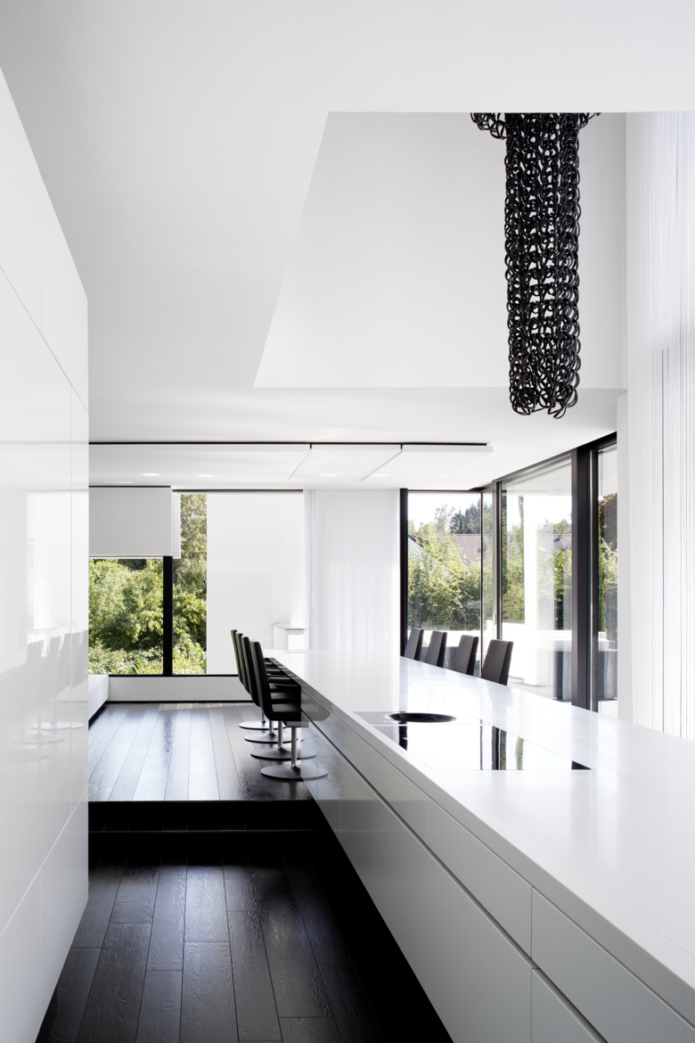 Located on the outskirts of Stuttgart-Vaihingen on a hillside, the villa Casa Murano appears as a cubic, three-storey building with a plastic articulated facade. The effect of the forward and backward jumps in the facade is enhanced by the alternation of white plaster and recessed black elements. The inside and outside facilities clearly show a continuation of the design principle. Thus, the ground floor is divided by height as graduations in the soil and suspended ceilings. In order to achieve a harmonious whole, had the architects make all furniture elements measured. A spatial relation between ground and upper floors in the kitchen is also produced by an air space above the kitchen area. This is also where a four-meter high chandelier from Murano glass elements is suspended. Thus, the villa got its name: Casa Murano.