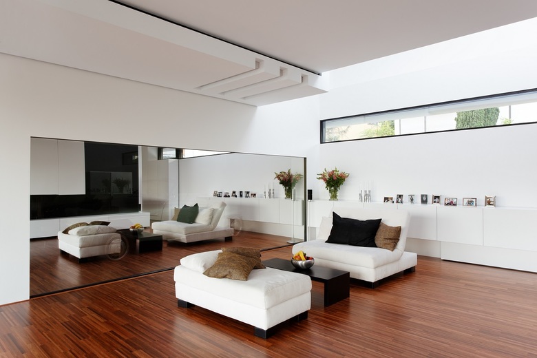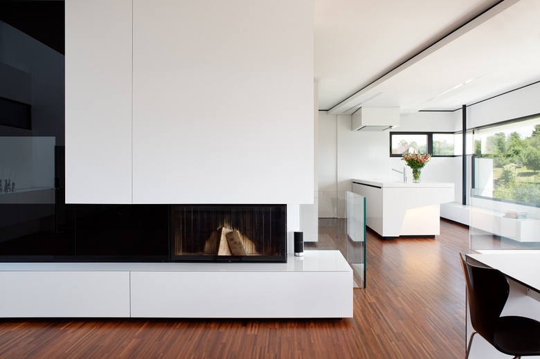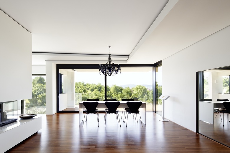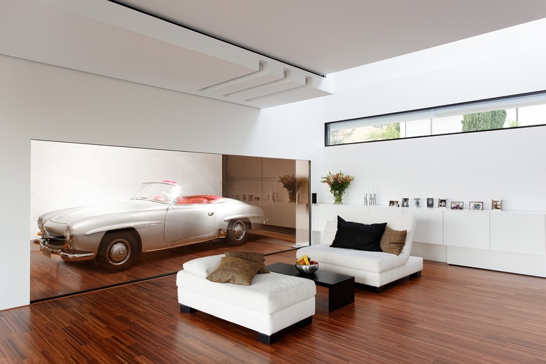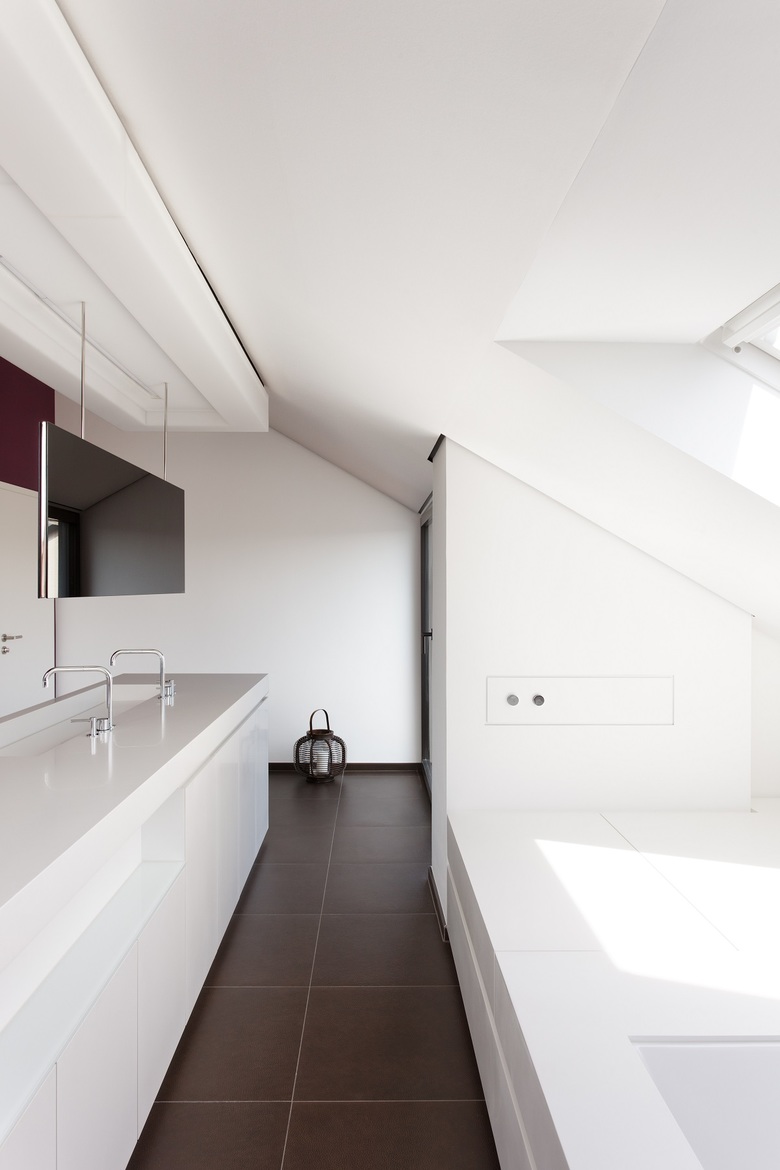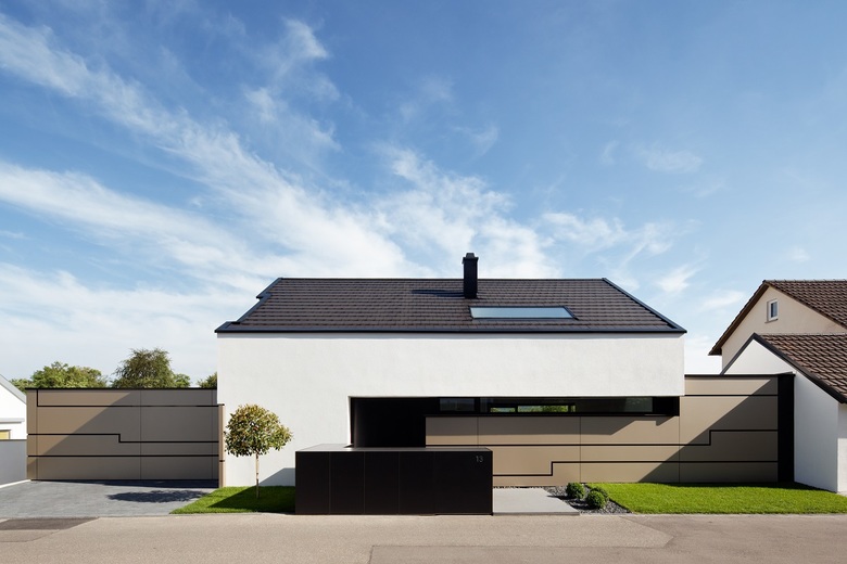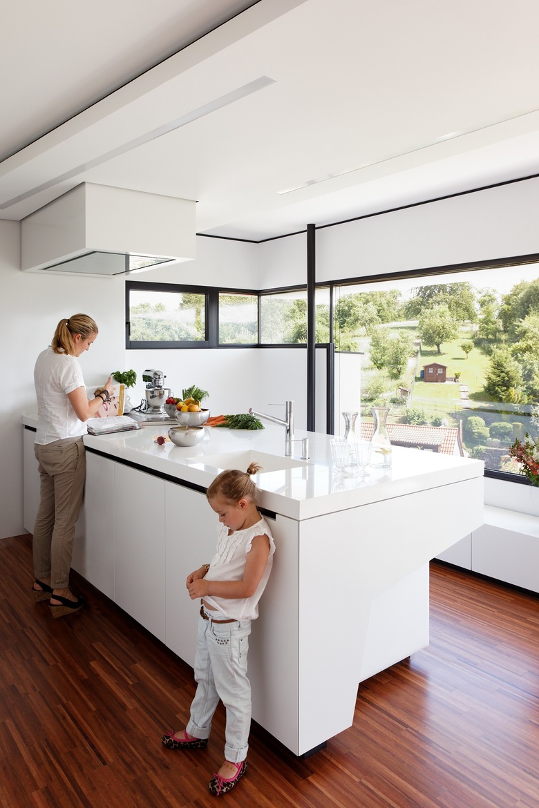 Built in Waiblingen on a hillside property that is limited in size by the trailing edge of a former quarry, different facades have been developed for this single family home. While the road side is very close and only two floors are visible, all three stories are open to the back garden. The roof is designed as a saddle roof and is in line with the surrounding buildings. Oblique incisions in the gable windows lead to a visual distortion of the classical type. Highly structured plastic is used to create forward and backward jumps on the front of the building which defines the buildings entrance. A gold coloured façade, made from plate material, holds together the garage doors and gates. From the garden, the plastic design helps covered areas such as terraces and balconies come into existence. In the living room there are exciting space situations created by the air space leading to the upper floor as well as by special materials used. There is a spy glass aimed towards the garage, giving the owner the choice as to whether to make the Oldtimer visible by switching on the light or to let the car disappear by switching it of. The warm coloured parquet floor and the white painted furniture create, for this scene, a quiet background. All furniture and kitchen fittings are manufactured according to designs by the architectural office and paint a consistent overall picture on all floors.