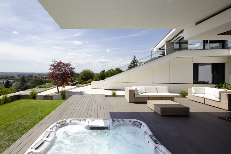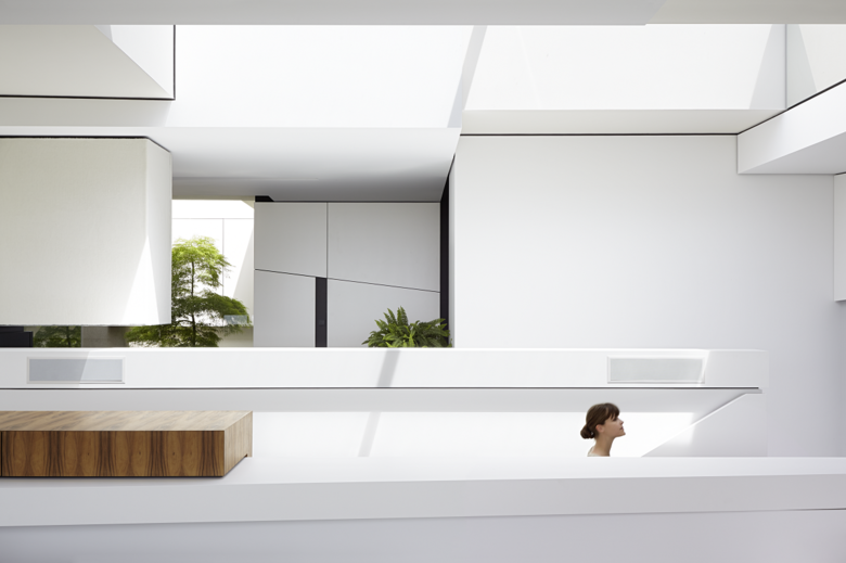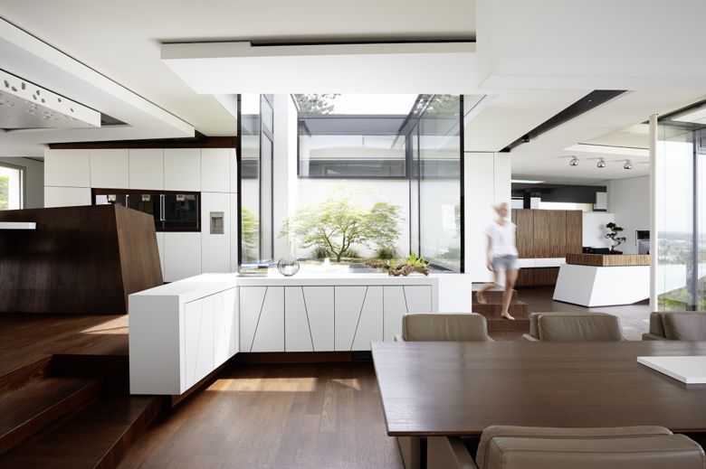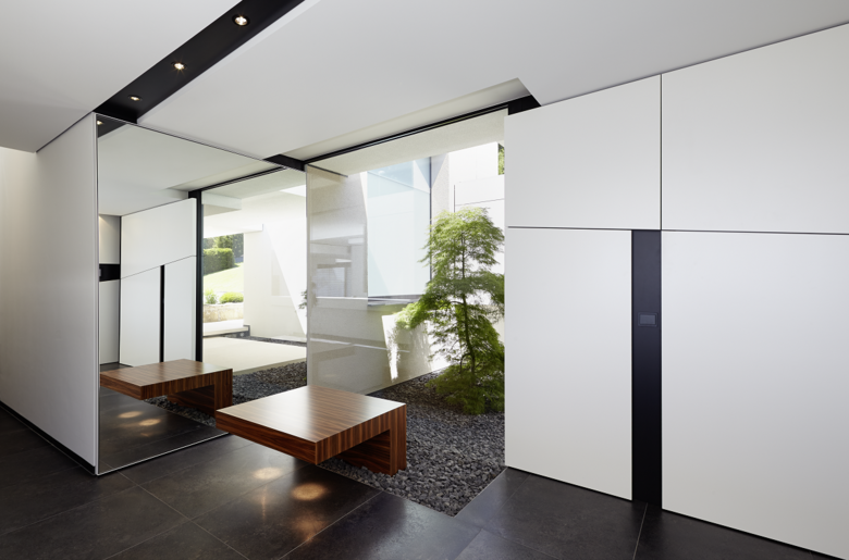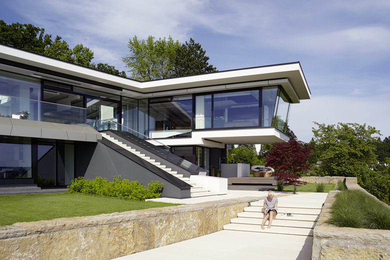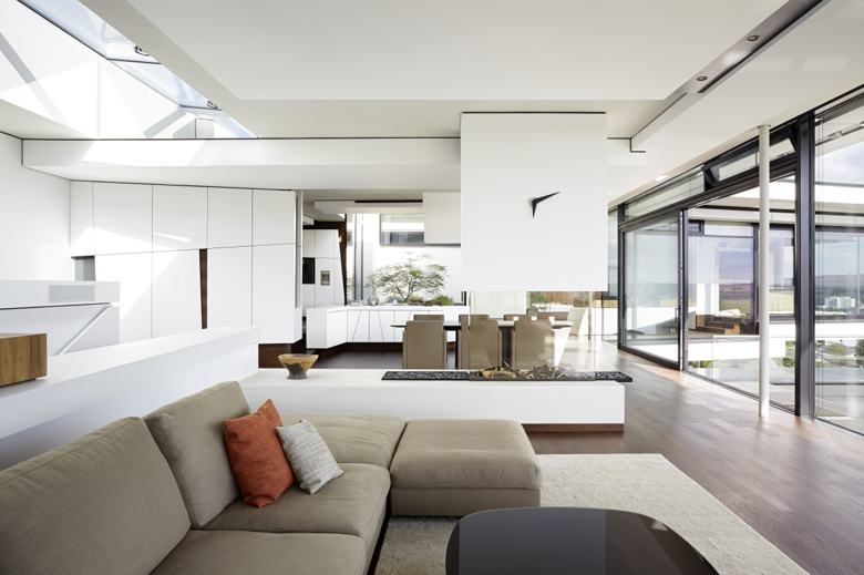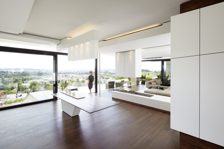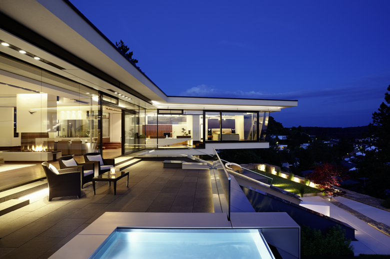 Die Villa Hollywood steht eingebettet in einen Hang mit weitreichendem Talpanorama und erschließt sich über zwei Ebenen. Im oberen Geschoß liegt die Hauptwohnung der Villa. Ihre teilüberdachte Terrasse verfügt über eine Außenküche mit großem Essplatz und findet ihren Abschluss in einem Wasserbecken mit infinity edge. Im unteren Geschoß, auf der Gartenebene befindet sich die Einliegerwohnung mit eigener Terrasse. Der Spabereich verfügt über eine Sauna, ein Wellnessbad, ein Sonnendeck mit Außendusche und überdachtem Whirlpool und ist wie die Technik- und Lagerräume ebenfalls auf der Gartenebene untergebracht. Durch die raumhohen Fenster und Schiebetüren öffnet sich die Fassade nach Süden. Seitliche Einblicke der Nachbarn und von der Straßenseite her sind durch massive Fassadenanteile ausgeschlossen. Das Schlafzimmer kragt als „schwebender“ Raum über das Whirlpool-Deck hinaus. Ein Lichthof im Zentrum der Hauptwohnung stärkt den Bezug nach außen. Raumbildende Elemente und Möbeleinbauten dienen als Zonierung und gliedern das offene Raumkonzept. Abgehängte Decken und Wandverkleidungen nehmen Stauräume, Durchgänge sowie notwendige elektronische und haustechnische Komponenten auf und wirken als einheitliche Oberfläche. Die umfassende Lichtkonzeption sowohl für die Innenräume als auch für die gesamte Gartenanalage ermöglicht zielgerichtete und atmosphärische Beleuchtung jedes einzelnen Bereichs. Edle Oberflächen wie Palisanderfurnier, schwarzes hochglänzendes Glas und Corian schaffen ein angenehmes Wohngefühl im Innen- und Außenbereich.