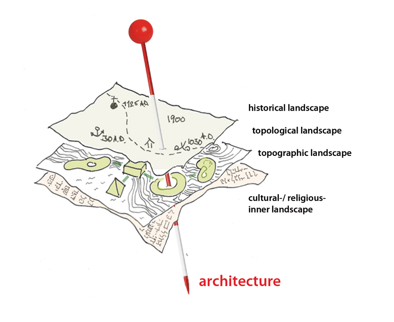 Eight drilled holes are exactly orientated to the four cardinal points and form thereby a gate to the east, south, west and north, following the path of the sun. The acupuncture of the rock fixes the layers topographic landscape, historic landscape, cultural landscape as well as the topological landscape and the religious/ psychological landscape. Architecture takes place and passes by.