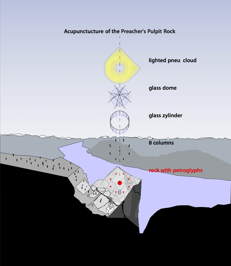 Every pilgrim to the rock leaves his / her prayers on the rock. The rock travels with the pilgrim, and changes the cultural landscape of Rogaland, Norway and beyond, as this competition prooves. The Pilgrimage to the rock is like walking on the palms of God's hand, leading to the sublime experience on the rock, which forms an open holding palm on which the pilgrim arrives exposed to the horizons.