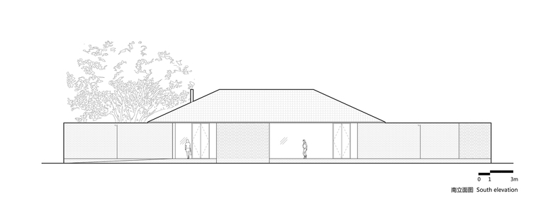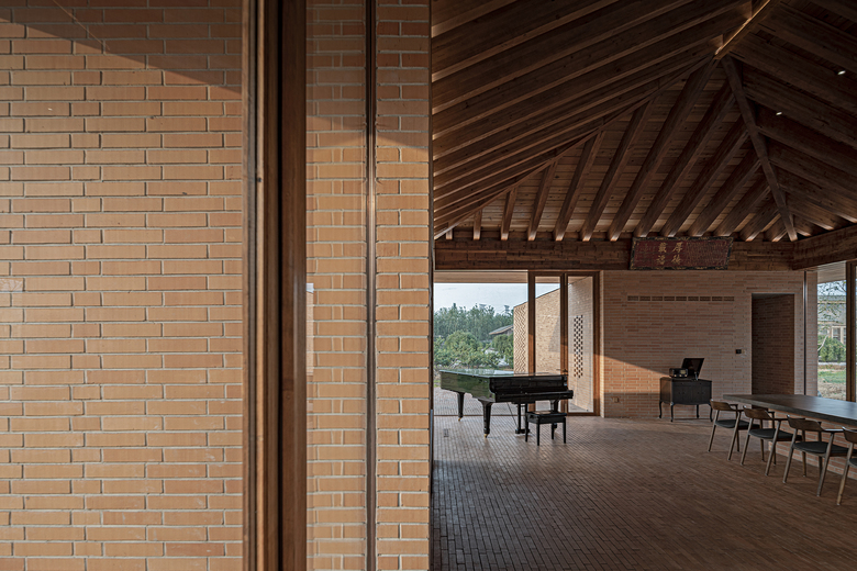 ARCHSTUDIO well handled the relationship among space, structure and materials, and tried to present the natural beauty of materials based on the characteristics of rural leisure space. The four rooms use steel framework and concrete slabs, with the wooden formwork of the in-situ concrete slabs exposed in the interior spaces. Beige shale bricks were utilized to construct the walls. The walls are composed of two vertical layers of bricks, with a thermal insulation layer in between, which improves the thermal performance, ensures identical material texture of the interior and exterior brick walls, and hides framework as well as pipes and wires of equipment. In the inner yards, large areas of the brick walls leave hollows, hence allowing natural air ventilation and light penetration. Pedestal surfaces, either inside or outside, are also paved with beige bricks. The pitched roof of the public area adopts wooden ribbed beams, with the rooftop clad in charred wood tiles. The combination of wood and bricks produces an austere, warm and natural interior ambience. In addition, the fireplace, dining table and piano further identify different public activity areas.
