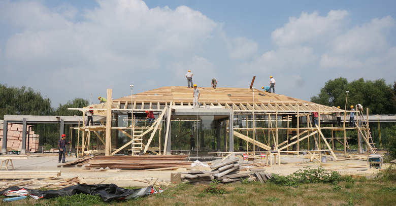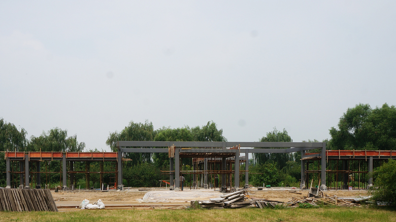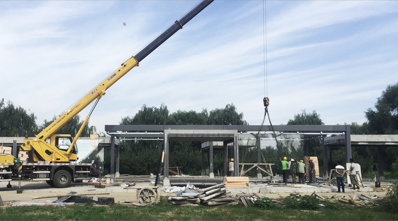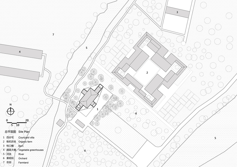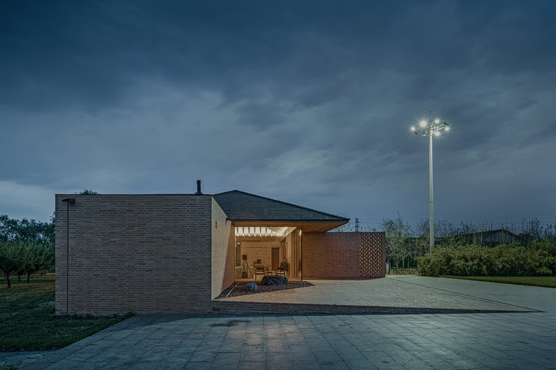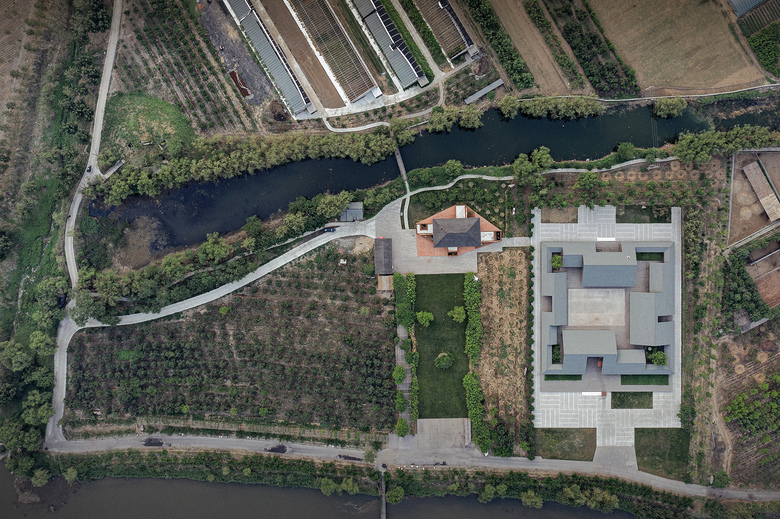 The project is situated on a flat site in the suburbs, which is surrounded by orchards, farmland and rivers, boasting beautiful landscape. On the west side is a grain processing factory, which is an enclosed architecture with pitched roofs designed by ARCHSTUDIO in previous years. There was originally a wooden house on the site, with a typical structure commonly seen a decade ago. To improve the quality of space, the house owner decided to demolish it and build a new architecture on the site. The newly built house mainly functions as a leisure and vacation space, serving for not only living but also receiving guests.