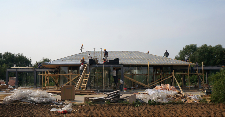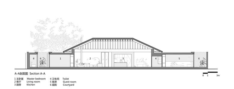 The design concept is derived from courtyard dwellings (Siheyuan), a kind of traditional Chinese residence. Siheyuan has an inward-facing architectural structure, with buildings arranged around a central courtyard. The exterior of Siheyuan is closed, while the interior courtyard is completely open, which offers little privacy for the occupants. Based on site conditions and the main functions of the project, ARCHSTUDIO decided to construct the house by borrowing and transforming the architectural pattern of traditional Siheyuan. The design team arranged four rooms on different sides in a scattered way, added a roof to the "courtyard" and turned it into a hall, and made the exteriors of the hall transparent and open, thereby letting the hall blend with the pleasant outdoor scenery, and ensuring the privacy of individual living spaces and openness for reception activities.