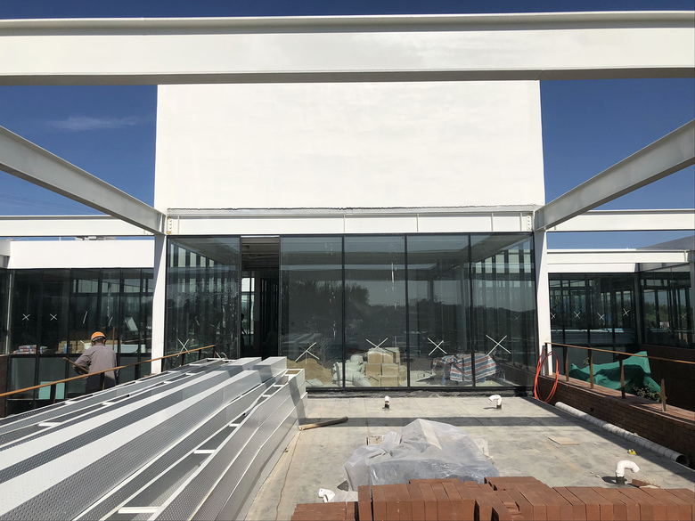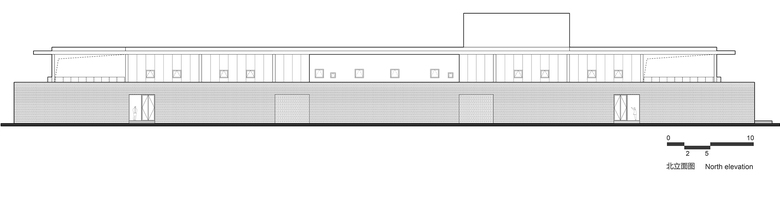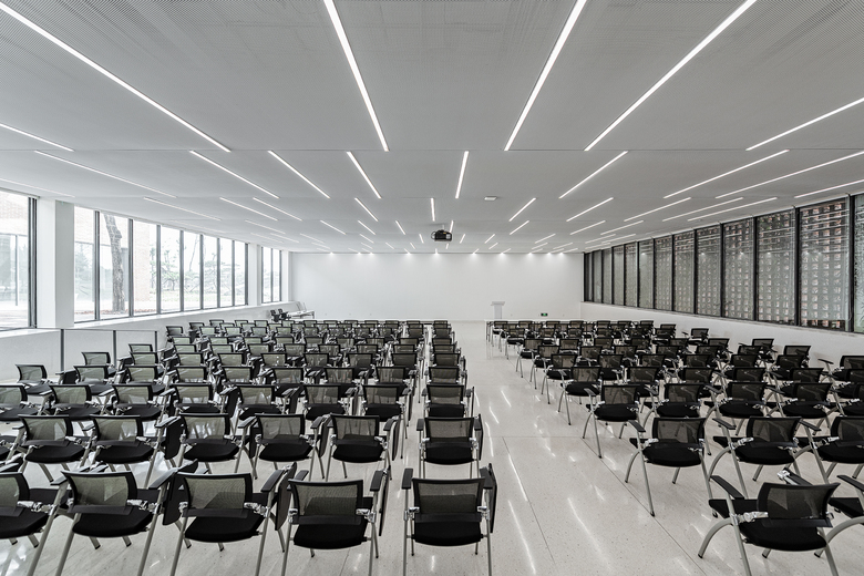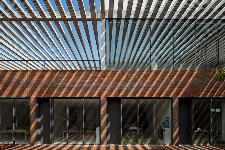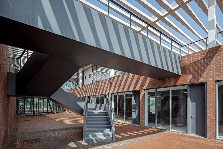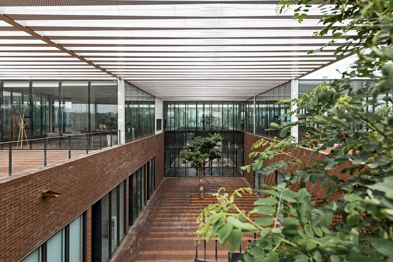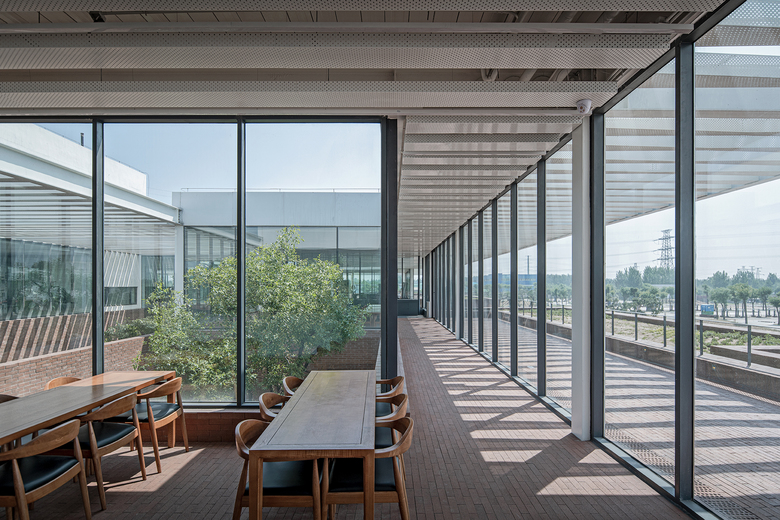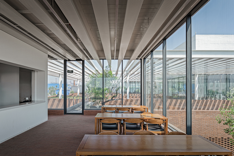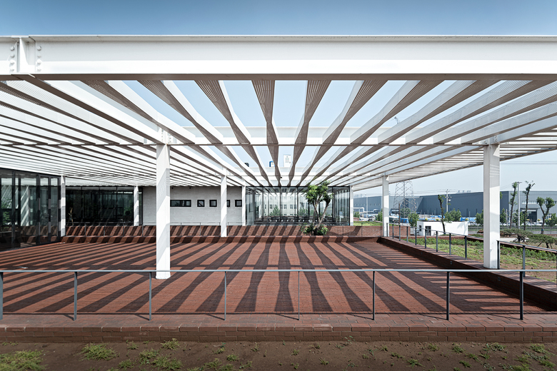 The entire architecture is covered by a 4,000-square-meter flat roof and sun-shading grilles formed by aluminum strips. The grilles draw on the linear forms of surrounding farmland, and soften floor slabs. From the building's middle area to east and west sides, the interspace between aluminum strips gradually decreases. Besides, each aluminum strip features width variations and perforated surfaces. The steel-structured rooftop of the three architectural blocks and the sun-shading grilles together constitute an integrated large roof. It looks like a lampshade with interspaces, which allows light to filter down, and thereby turning the building and courtyard beneath into a "forest" of light and shadows. The varying light brings changes to spaces throughout the day. The rhythmic interplay of light and shadows, as well as human activities, together produce distinctive vivid scenes.