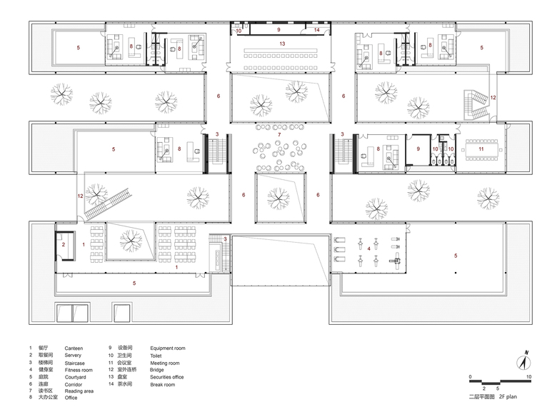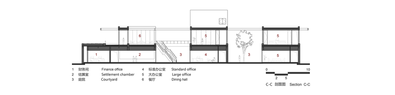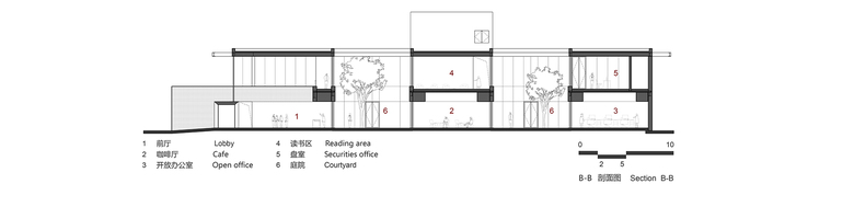 The office building consists of two floors, which present totally different visual impressions. 1F is enclosed and inward-facing, while 2F is open and outward-facing. Such contrast highlights the horizontal layout of the overall architectural space. The building has a "floating" rooftop, a solid pedestal and a transparent space in between, which is similar to the image of traditional architectures to some extent. Several two-storey-high courtyards separate 1F into three parallel horizontal functional blocks. In this way, each room on 1F is connected with a courtyard, ensuring ample daylight and forming diversified landscape. Besides, the block on the south itself includes some small-scale courtyards. 2F has a large area of glass curtain walls, which mark off various functional spaces of different scales and also enable indoor activities to be extended to outdoor terraces freely. Six bridges link the three functional blocks of the building, generating efficient circulation routes and further dividing off several inward-facing yards.