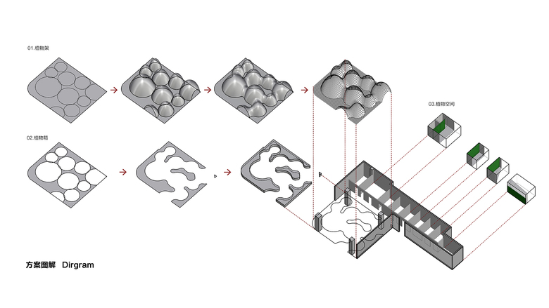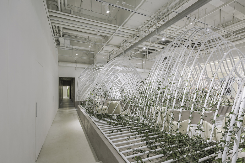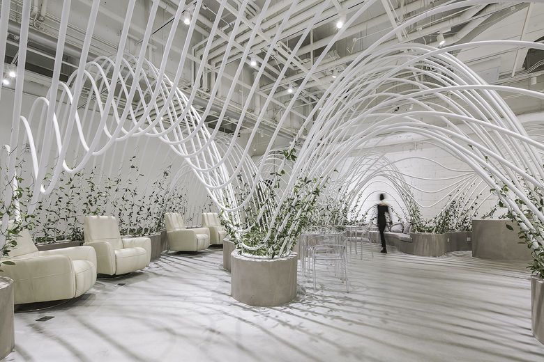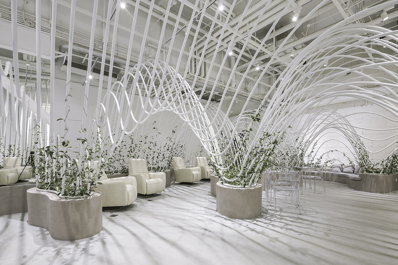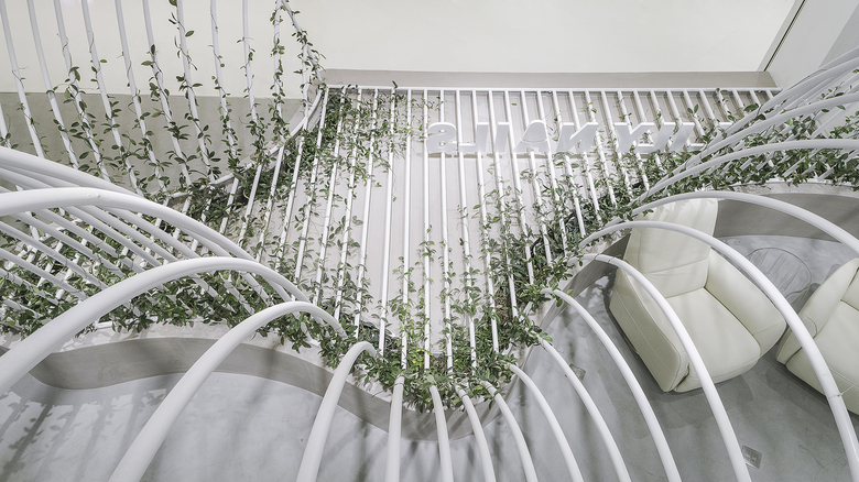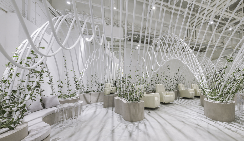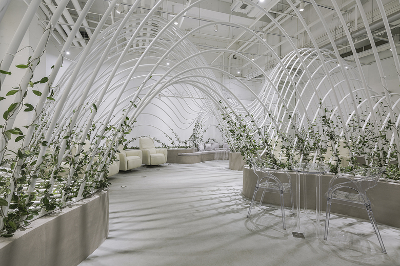 Firstly, the designers divided the whole space into public and private areas. The public area is an open botanic garden. According to the requirement of reception, waiting, manicure, activity, and other functions, it has 10 "hills" in different sizes. The "hills" are interconnected with each other to create an open and flowing path, and some white galvanized steel pipes in 32mm-diameter and 3mm-thickness are used to draw rolling outlines of the "hills". The abstract "hills" are placed on the 550mm high cement platform, around which is decorated with climbing plants. The green porcelain flowers are growing along the outlines vibrantly, reminding people of the changes in time and space.