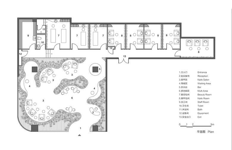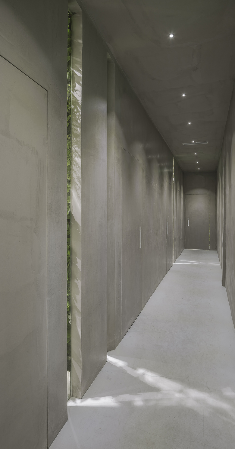 The private area is for beauty rooms and manicure rooms. With vertical green walls in the rooms, all of them like mini botanical gardens. Each square box is divided into white and gray parts. People sit in the white space and face the plant wall in the gray space, breaking the closed feeling of a single room. The greenery and light permeate through the glass gap in the room, and their shadows are projected in the corridor, creating more interactive experiences.