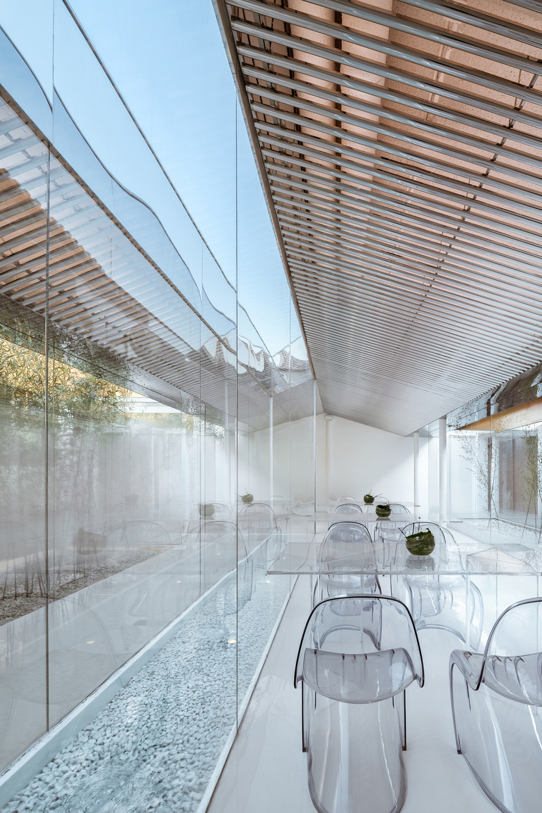A prominent feature of traditional architecture is the layering courtyard. In a quadrangle courtyard with three layers, a house's function changes as people entering each yard, the privacy gradually increases from outside to inside, giving people an impression of "deep courtyard". The design was inspired by "multiple layering courtyard" in traditional spaces, thus the previous inner courtyard was changed into a "three-layered courtyard" in order to adapt to the transition from the public spaces to private spaces step by step, besides, the designers took advantage of the yard's layering structure to create a quiet, natural and poetic scene in a noisy Hutong neighborhood. "Layering Yard" has rearranged the relationship between new and old, inside and outside, artificial and natural. Firstly, the designers demolished some parts of the house roof in the south so that the first layer between the interior space and street yard was created, secondly, they added a slope-roof building between houses on the north and south, and then separated the old and new with two parallel yards. The three-layered courtyard allows all indoor spaces to be accompanied by bamboos and sunlight. The spaces are separate but penetrate with each other, the glass walls with spray patterns look like overlapping peaks, which further strengthen the translucent sense, thus achieving the layering juxtaposition of different scenes and living situations from outside to inside.