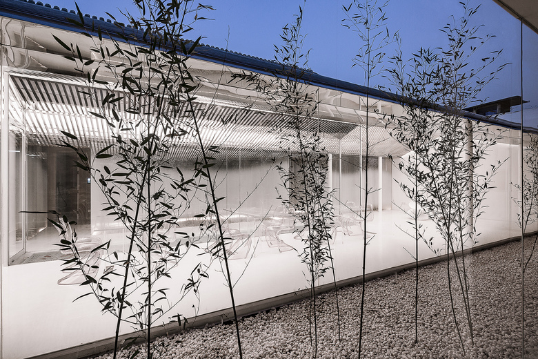 The house's usage patterns follows the naturally transition from openness to privacy of the three-layered courtyard. The south house is a place for public gathering activities, with an arrangement of reception space, dining room, bar, kitchen, office, warehouse and so on. The original wooden beam and column structure was preserved as much as possible, and two new wooden box service units were placed inside to divide spaces of different scales. Through the first layering yard, the window openings of the original building and the painted doors form the effect of "shadow wall", together they outline a real and colorful Hutong life scenes under the setting of bamboo forest. The house in the middle was changed into a flexible multi-functional space, which can be used together with the front restaurant, or as an independent exhibition hall, or be integrated with the guest room area to become a rest area. The designers tried to consider the harmonious relationship between the new building and the two old slope-roof buildings on both sides in terms of the scale, lighting and distance. The inner spaces were built around a linear waterscape garden, and mainly used transparent, translucent, reflective materials and furniture to weaken the spaces' physical feeling and create a light, transparent and floating atmosphere that is different from the old building, making the spaces allusive and concealing in the bamboo courtyard. Houses on the north side are the most private places. The designers made use of the original structure to divide the first floor into four rooms. The rest area and bathroom area were separated from each other by the change of materials. Each guest room has an individual bamboo courtyard, and the inside and outside are stacked with one another. The second floor was divided into three rooms of different sizes. Through the floor glass curtain wall, people can enjoy the best views of layered gray tile roofs, green trees and blue sky. All rooms are equipped with facial recognition and intelligent control system. Guests can book a room online and scan a code to check in, providing an easier and more convenient living experience.