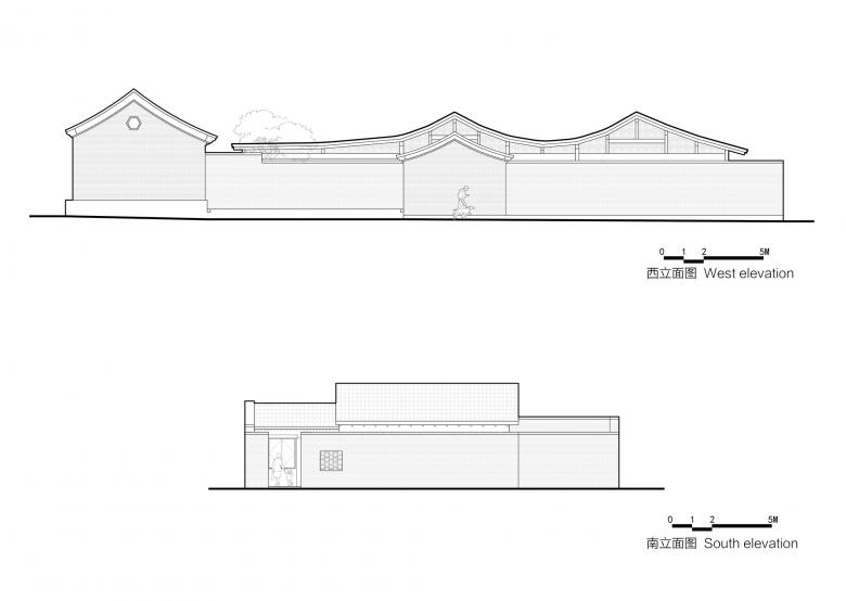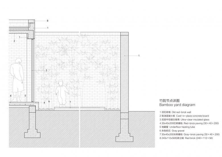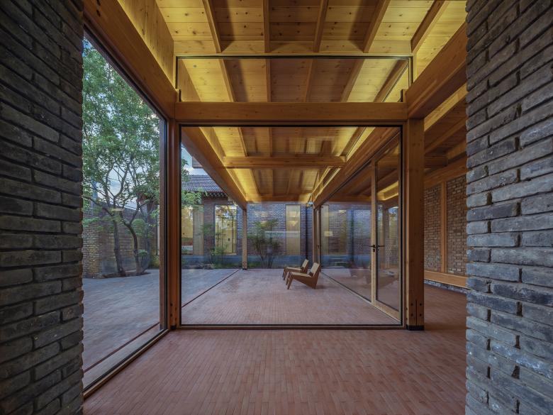 The newly built enclosure walls are completely made of red and gray old bricks recycled locally, which realizes the reuse of waste materials. When renovating the existing buildings, the design team decided to remove and polish the white ceramic tiles on the exterior of the preserved north building to expose its red-brick walls. As demolishing parts of the south building's roof, the designers found that its original structures were seriously damaged and the walls under it were at the risk of collapse. Therefore, they took the roof apart, and replaced some old wooden components with new ones. Meanwhile, the walls were rebuilt with old gray bricks in consistent with their original forms.