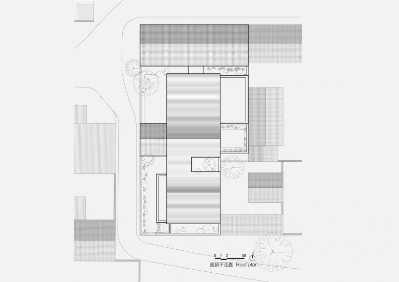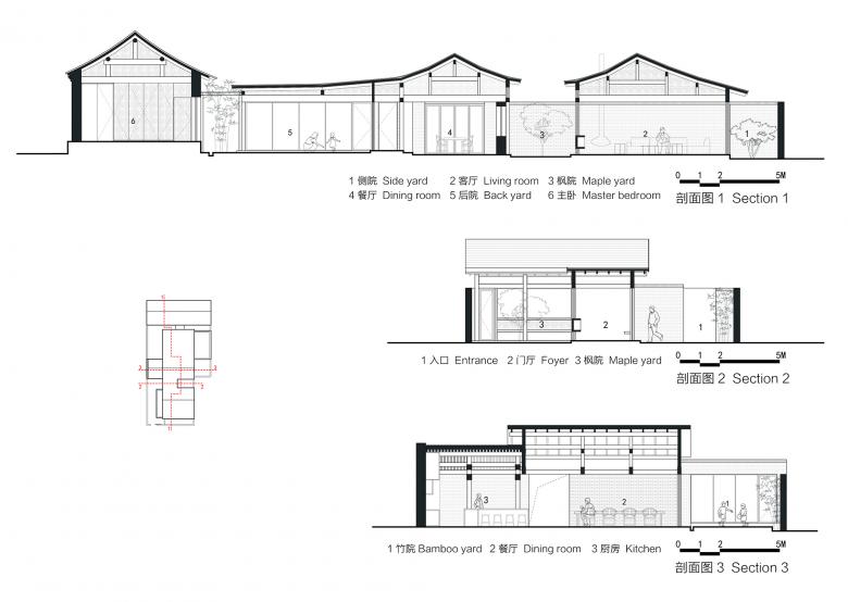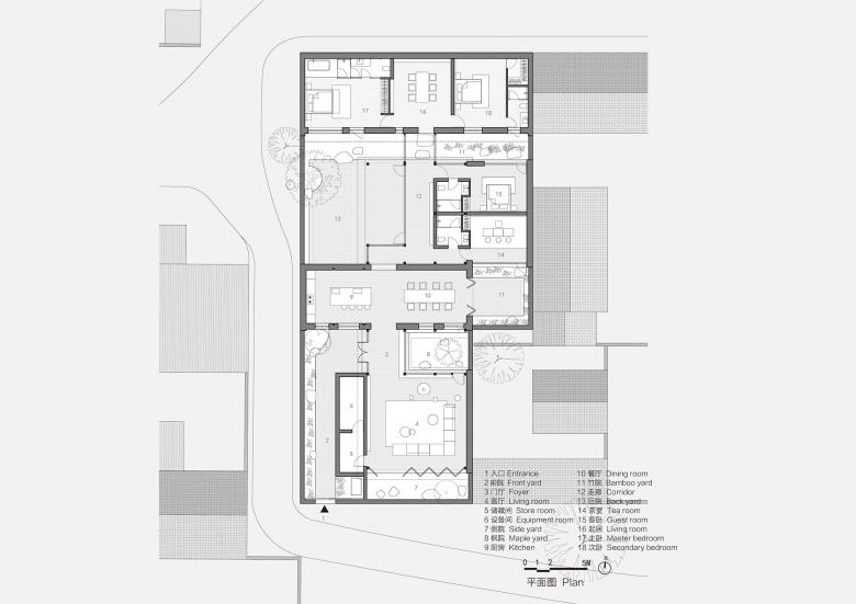 The original spatial pattern featuring one front yard and one back yard are reorganized, to form six yards with different scales, landscapes and functions. The front yard is set at the southwest core of the site. Opening the metal gate, a bamboo path leads the occupants to the building entrance. Pushing the door and entering the foyer, a courtyard with a maple tree comes into view. The maple tree displays the colors of nature in different seasons, and becomes a highlighted view between the living room and the dining room. Space set aside between the living room and the south enclosure wall forms a side yard, where trees and stones are set. In sunny days, the folding doors of the living room can be completely opened, to extend the yard into the interior.
