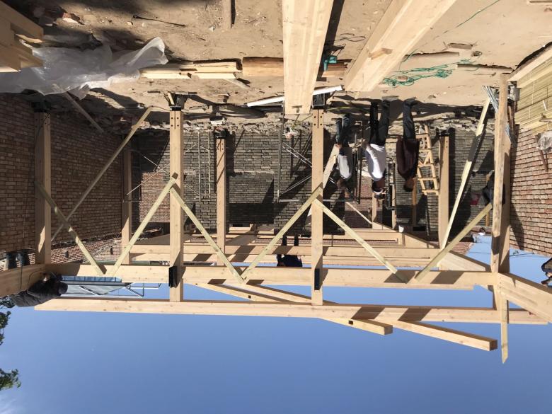 The newly built wooden construction adopts cedar plywood as main material and applies traditional beam-lifted frames, to echo the features of traditional northern Chinese houses. By fully utilizing plywood, a low-carbon and renewable natural building material, the newly inserted wooden construction continues the existing old house's wooden frame with new structural expressions, hence creating a dialogue between the old and the new. Moreover, the undulating new roof is constructed with beams and columns featuring minimized cross sections and maximized spans, to ensure a reasonable structure and control costs.