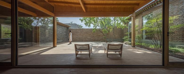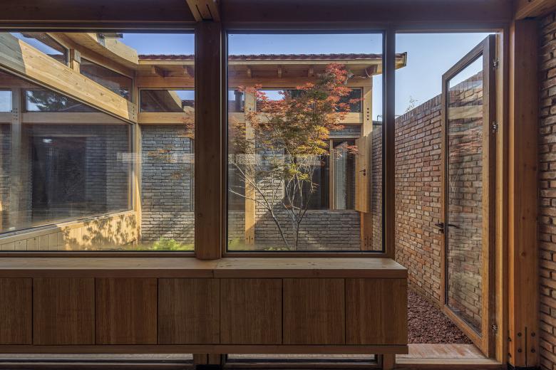 The space at the back is the bedroom area. The north building and the wooden construction are connected by a glass corridor, which naturally forms a narrow yard. The three bedrooms provide a direct view to the outdoor landscape, satisfy daylighting and ventilation needs, and meanwhile avoid obstructed sight lines. The organization of various yards brings natural vitality into every corner of the interior space.