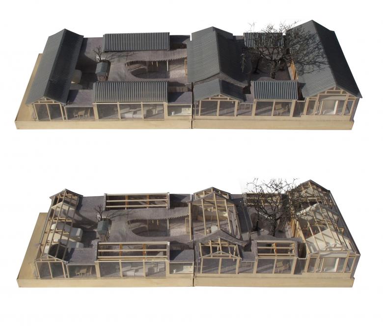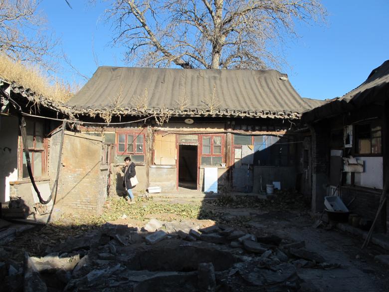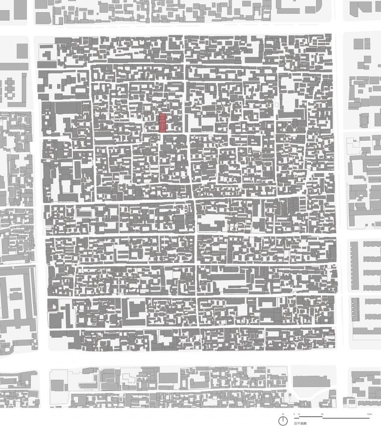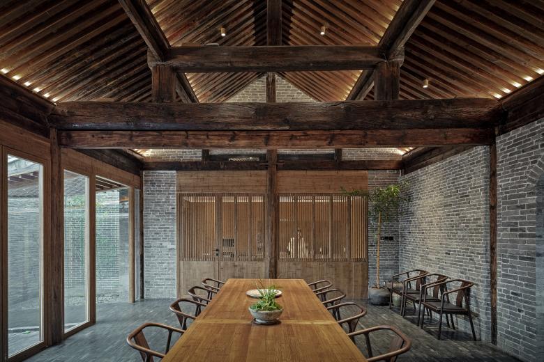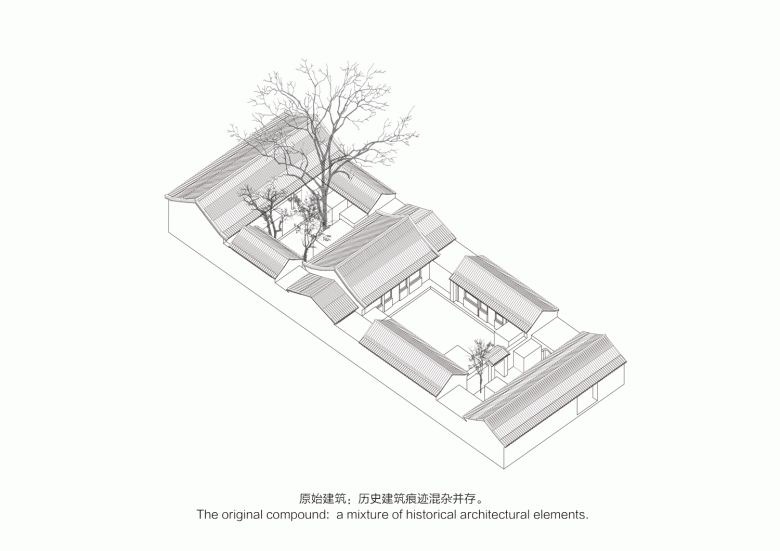 The renovation project is located in a huton within a core old quarter of Beijing. It's a small Siheyuan (a typology of traditional Chinese residence) with three courtyards, with a total length and width of 15 and 42 meters. It's named as "Qishe" ("Qi" and "she" respectively refers to "seven" and "house" in Chinese language), because its address number in the hutong is 7 and it originally consisted of 7 pitched-roof buildings. The Siheyuan before renovation was old and dilapidated. The basic wooden beams and some arched door openings featuring the style of the Republican era were relatively well preserved, while most of the roofs, walls, doors and windows were badly damaged or disappeared. In the three courtyards, there were many temporary architectural blocks inserted many years ago. After demolishing those blocks, the yards were filled with waste of construction materials and overgrown with weeds, presenting a bleak view.