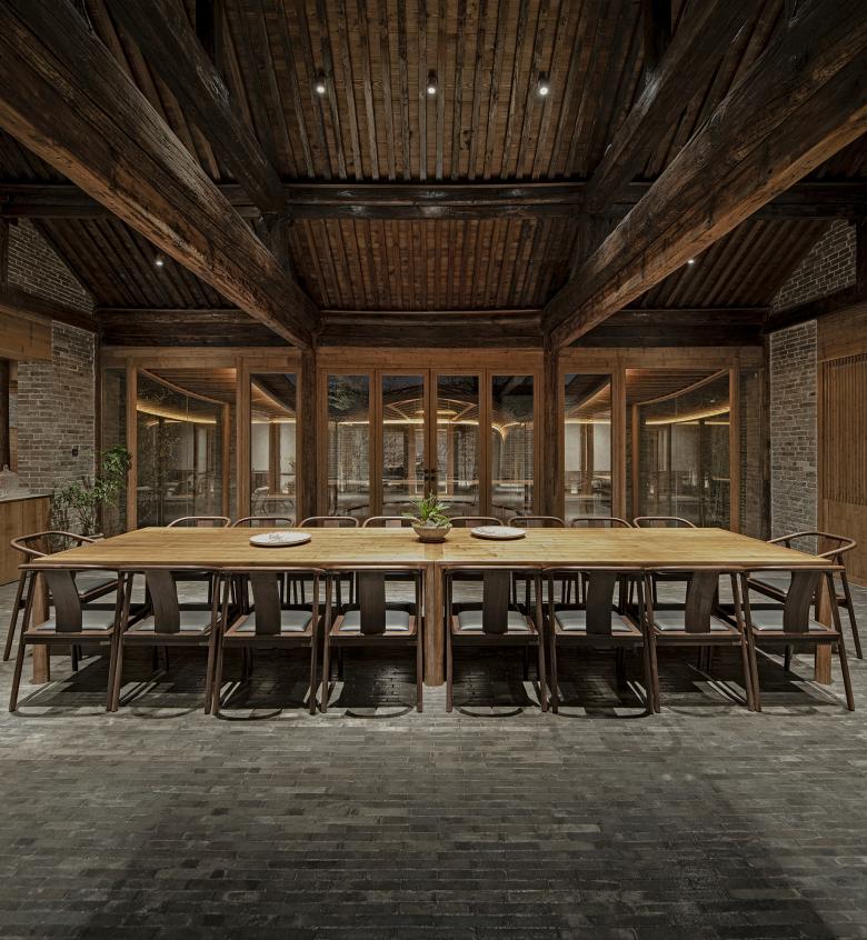 The traditional pitched roofs used no modern waterproof materials and had poor thermal insulation. Considering this, ARCHSTUDIO optimized the roof system and performance on the premise of retaining the original gray tile rooftops. As to the curved roof of the newly built veranda, the designers utilized polymer mortar as the finish, which is smooth and forms contrast with the adjacent textured tile rooftops. The old building walls were restored, by reusing the gray bricks from demolished temporary architectural blocks in the courtyards. The floor of outdoor spaces is paved with the same type of bricks, to ensure visual consistency. Some of the new walls are formed by glass bricks, which have the same size as the old gray bricks. During construction, some stone slices, crocks and a millstone were found unexpectedly, which were later reused as stairs, flowerpots and adornments. The wooden beam waste from the architectural renovation was utilized to make chairs, which gives old materials new life.