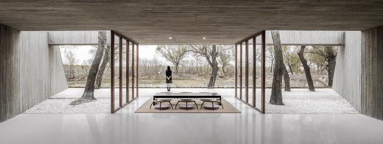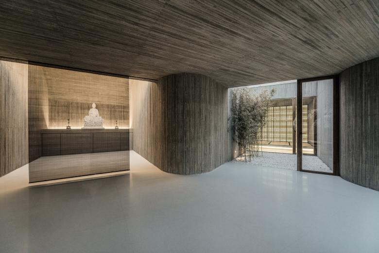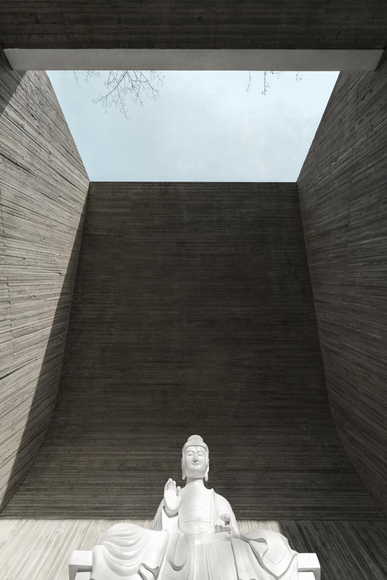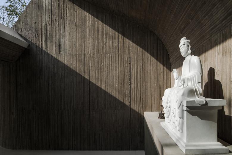 This is a place for Buddhist mediation, thinking and contemplation, as well as a place satisfying the needs of daily life. The building is located in the forest by the riverside. Along the river, here is a mound, behind which is a great stretch of open field and sporadic vegetable greenhouses. The design started from the connection between the building and nature, adopts the method of earthing to hide the building under the earth mound while presenting the divine temperament of nature with flowing interior space. A place with power of perception where trees, water, Buddha and human coexist is thus created.