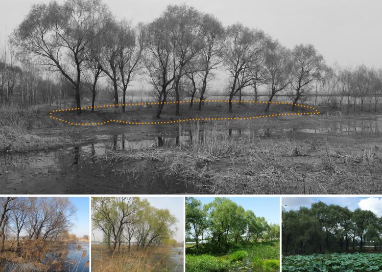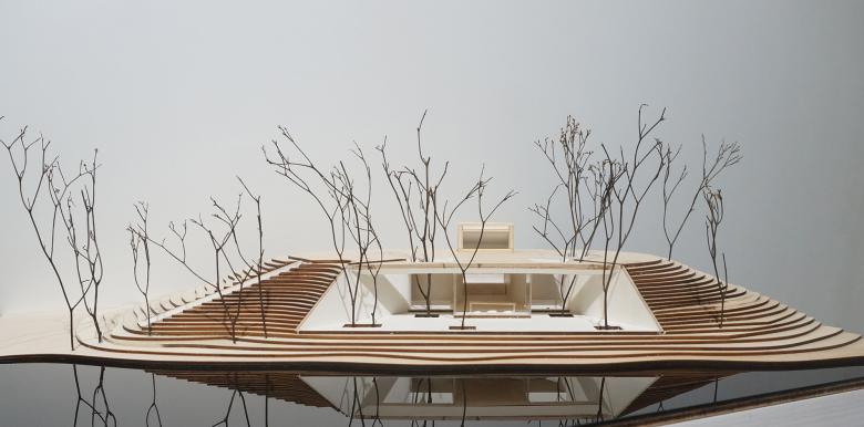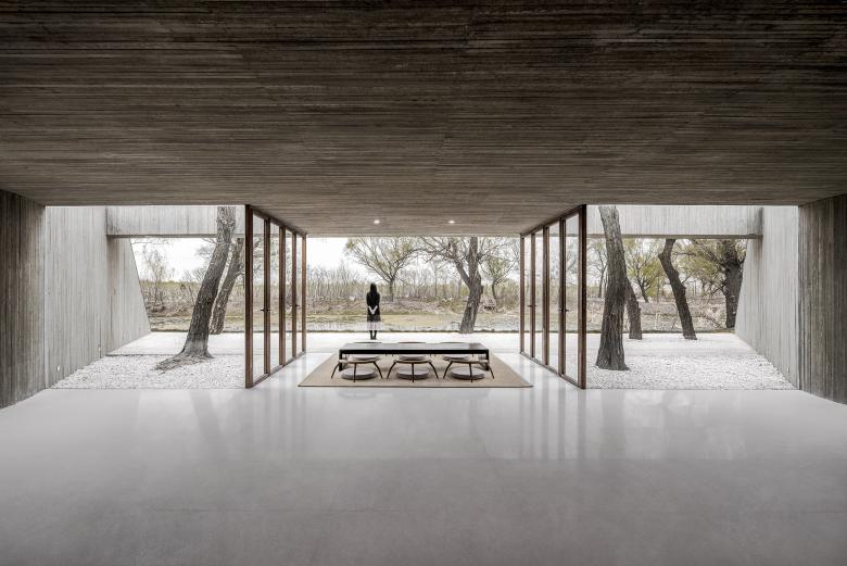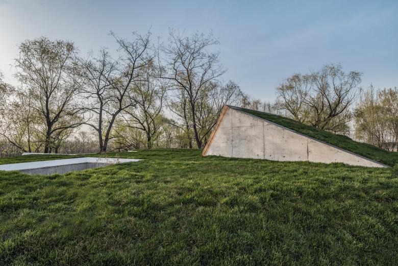To remain trees along the river perfectly intact, the building plan avoids all trunks. Shape of the plan looks like branches extending under the existing forest. Five separated and continuous spaces are created within the building by two axis, among which one is north-south going and another one goes along the river. The five “branches” represent five spaces of different functions: entrance, Buddhist meditation room, tea room, living room and bathroom, which form a strolling-style experience together . The building remains close to trees and natural scenery. The entrance faces two trees; people need to walk into the building through a narrow path under the trees. The shrine is against the wall and facing the water, where the light and the shadow of the trees get through the skylight and flow into the interior space softly along the curved wall, exaggerating the light of Buddha. The tea room opens completely to the pool which is filled with lotus, and trees on both sides of the tea room has become part of the courtyard, creating a fun of tea tasting and sight-viewing. The lounge is separated from other parts of the building by a bamboo courtyard; such division enables daily life varies with different hours of a day. The whole building is covered with earth and becomes an extension of the land, as another “mound” which could be used under the trees.