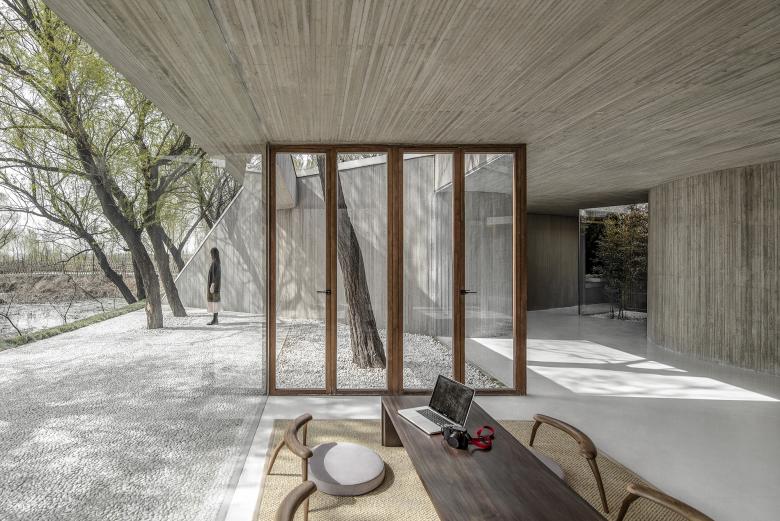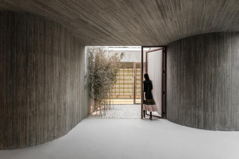 The relationship with nature further extends to the use of materials. Integral concreting is used in walls and the roof of the building. The concrete formwork is pieced together with pine strips of 3cm width, in this way natural wood grain and vertical linear texture are impressed on the interior surface, creating a soft and warm feeling to the cold concrete materials. Built-in-furniture is custom-made with wood strips, whose grey wood grain is a little bit different from the concrete walls. Smooth terrazzo is used for the interior floor, where there is thin grain of stone on the surface, and it maps the outdoor natural landscape into the interior space. Cement grouting with white pebbles is adopted in outdoor flooring, which creates a difference in sense of touch between indoor and outdoor floor. To reflect natural texture of the materials, solid wood is used for all doors and windows. Zen stresses on complying with nature and being part of nature. That is also the goal of the design for this space—taking use of space, structure and material to stimulate human perception, thus helping man and building to find the charm of nature even in an ordinary rural landscape, and to coexist with nature.