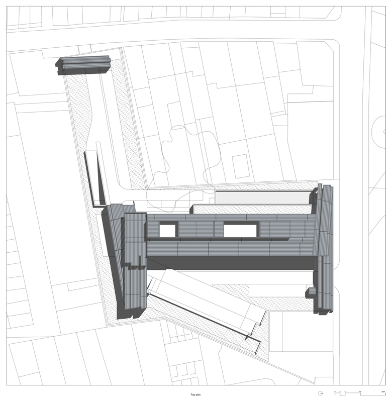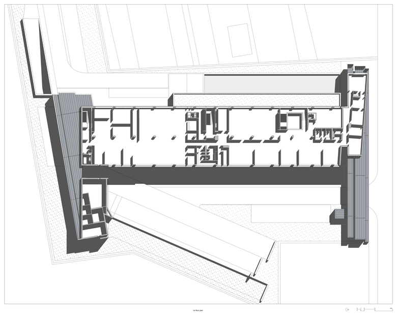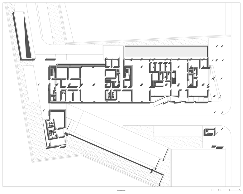 The building varies between a dominating systematic matrix of a technological nature and sparse subjectivities, as spontaneous reactions to the site.