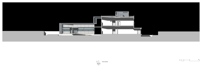 The building-as-line runs through the polygon´s different directions searching its geometry. Along its apparent motion, it comes to stability as different segments of variable conditions: thick and sitting on the ground, floating and thin. The extremities touch the streets gently: the building is lifted on Bolama str. announcing the main (public) entrance’s obvious permeability, peeking over the Covelo Park wall across the street; on the opposite end (Visc. Setubal str.) it becomes a technical arch (service entrance) cutting through the renovated granite wall of the old farm.