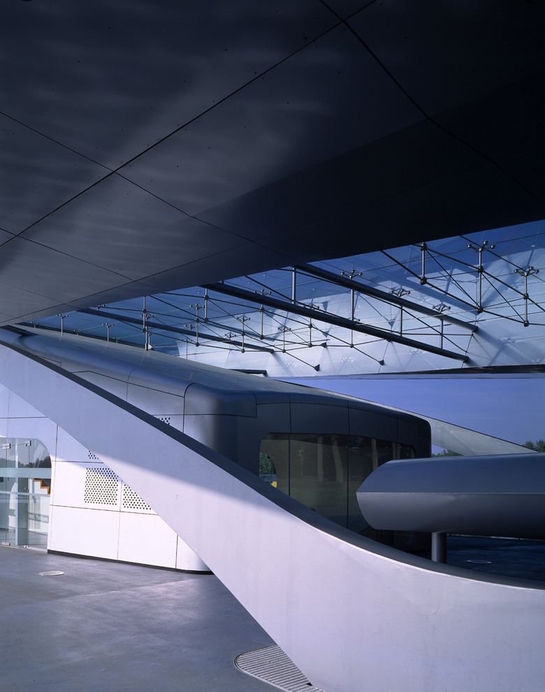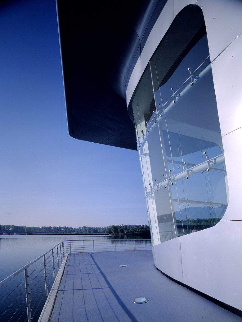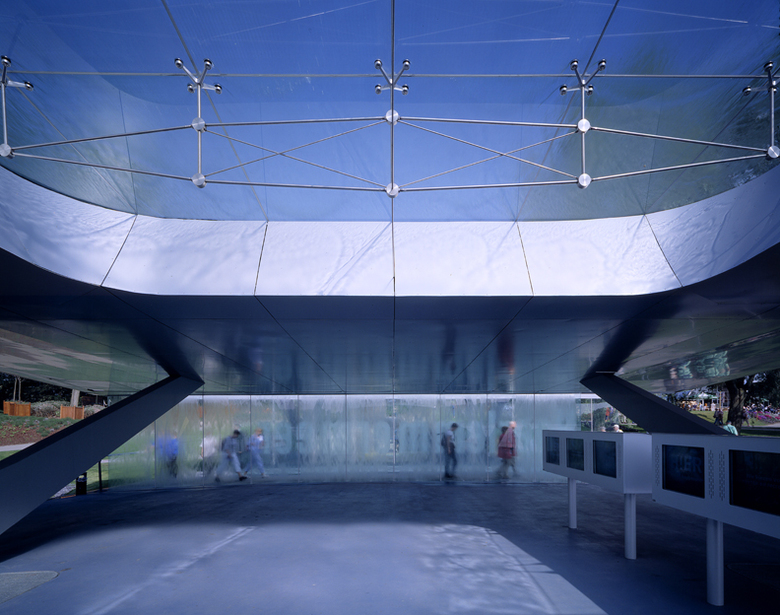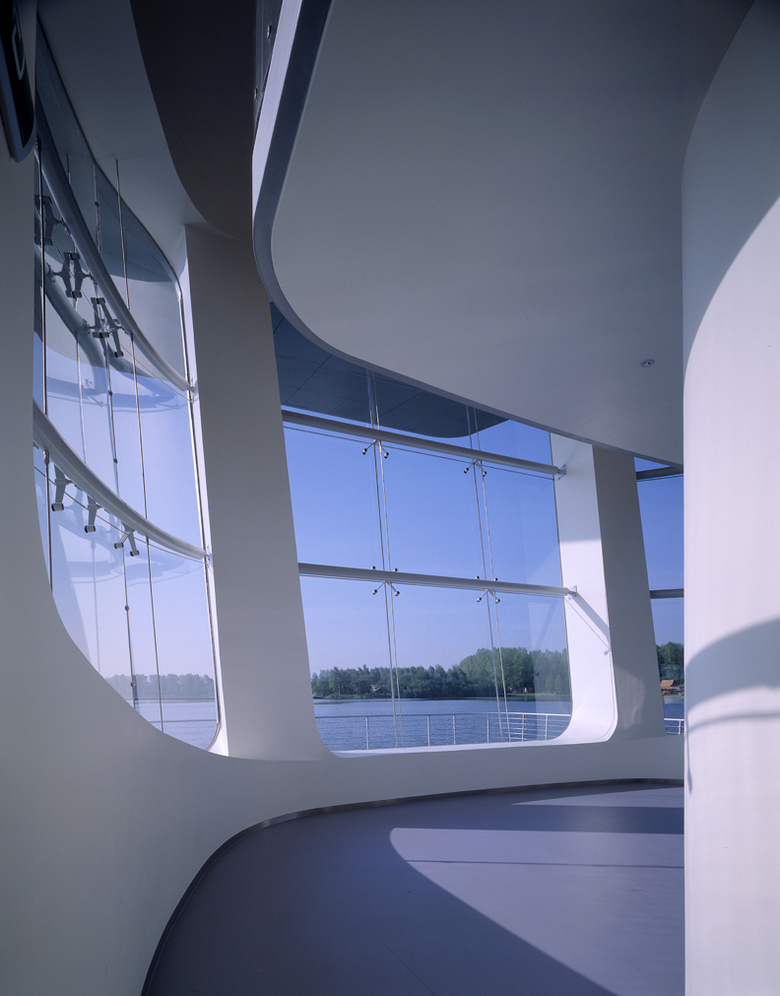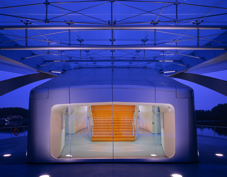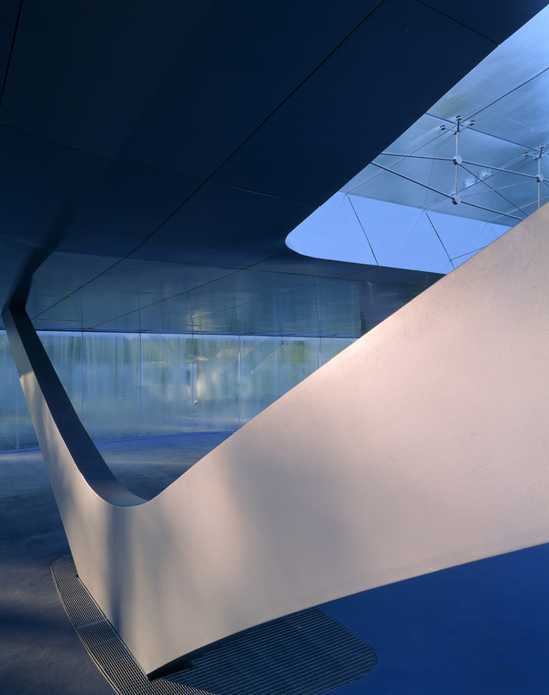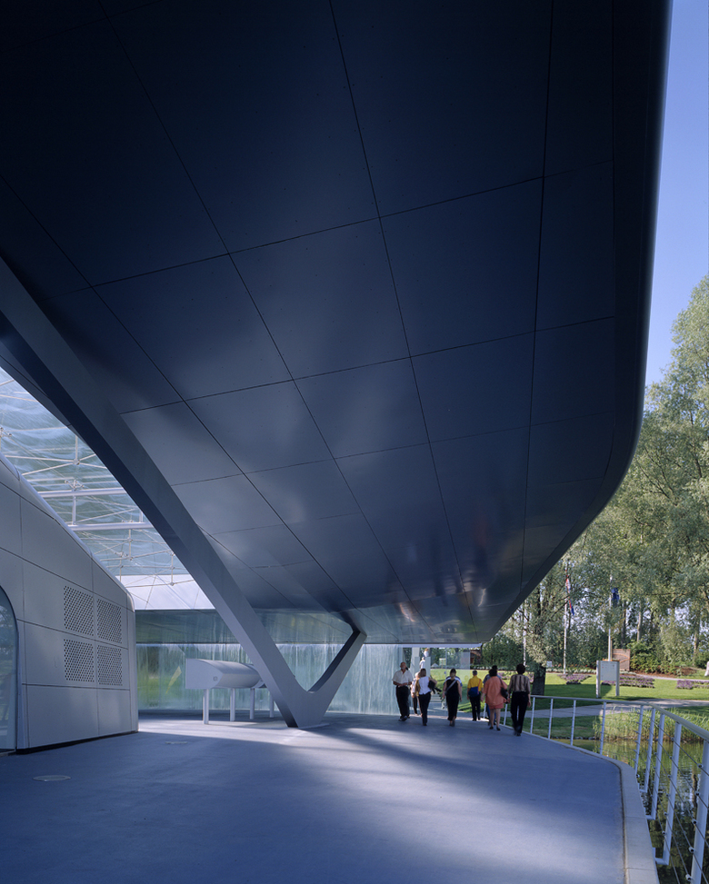 The award-winning HydraPier Pavilion is a 1,200-square-meter structure inspired by both technologies of flight and hydra-engineering located in Haarlemmermeer, The Netherlands in close proximity to Amsterdam’s Schiphol airport. The pavilion is a 100-meter-long, pier-like structure that projects onto an artificial lake and a controlled movement of water fuses with the architectural surfaces to create a reflective and, literally, fluid surface. Water continuously flows down the two inclined planes of the roof and onto two glass walls located on either side of the entranceway.