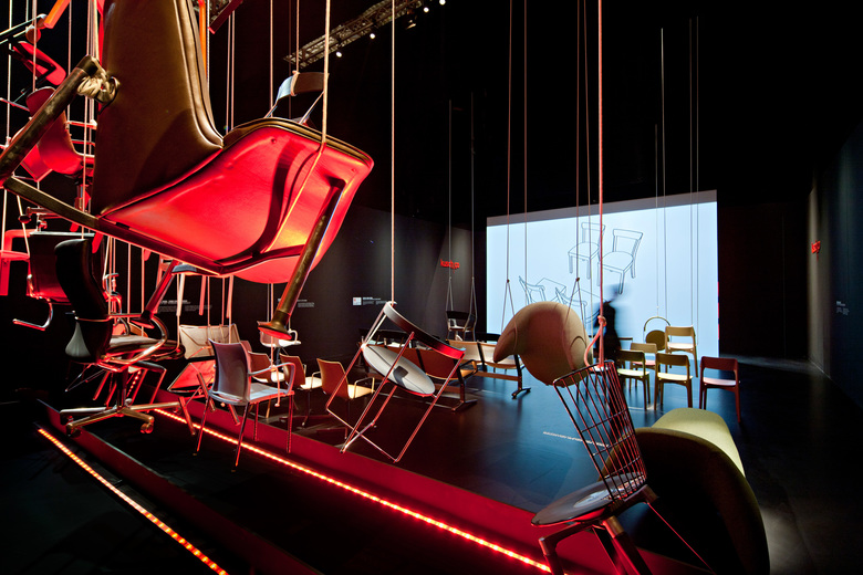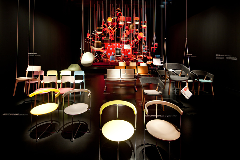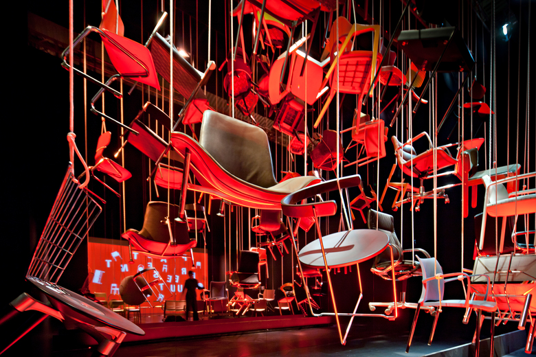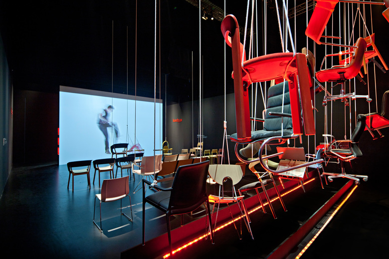 Milan Design Week – An installation in the form of stage scenery places the design classics from Kusch+Co in a context of new products. About 50 chairs are presented chronologically under spotlights in an exhibition area of 180 square metres. The historical chair models, featured by red accents and suspended in front of a mirror wall, form a gallery of ancestors, which continues in rows of current chairs on the parquet. The visitors themselves are integrated into the staged setting, standing together with the chairs on the stage, and are invited to take a seat. The stage becomes the auditorium. Films ties the seating items into narrations. In these short films, the visitor experiences the chairs as protagonists. They become active, changing their role from a prop to the main actor. The six to seven metre-high mirror reflects these stories into the installation. The narrative space becomes a living setting.